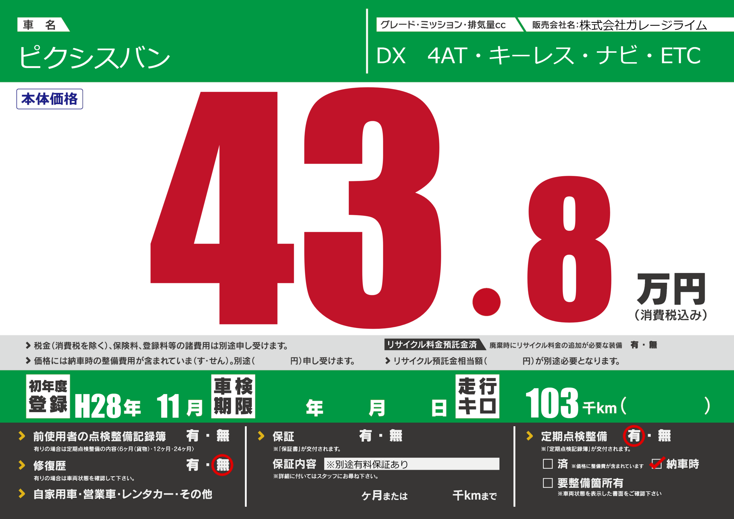 | 定期点検整備 | 定期点検整備あり 納車時あり | ||