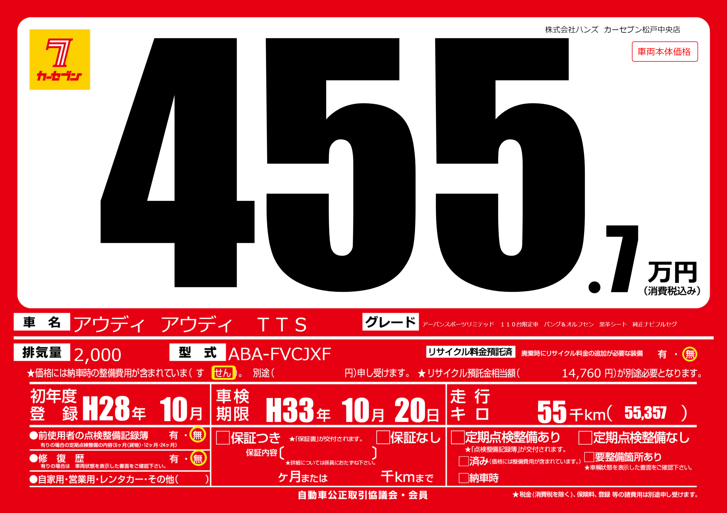 | 車名 | アウディ アウディ TTS | グレード ミッション 排気量 |
