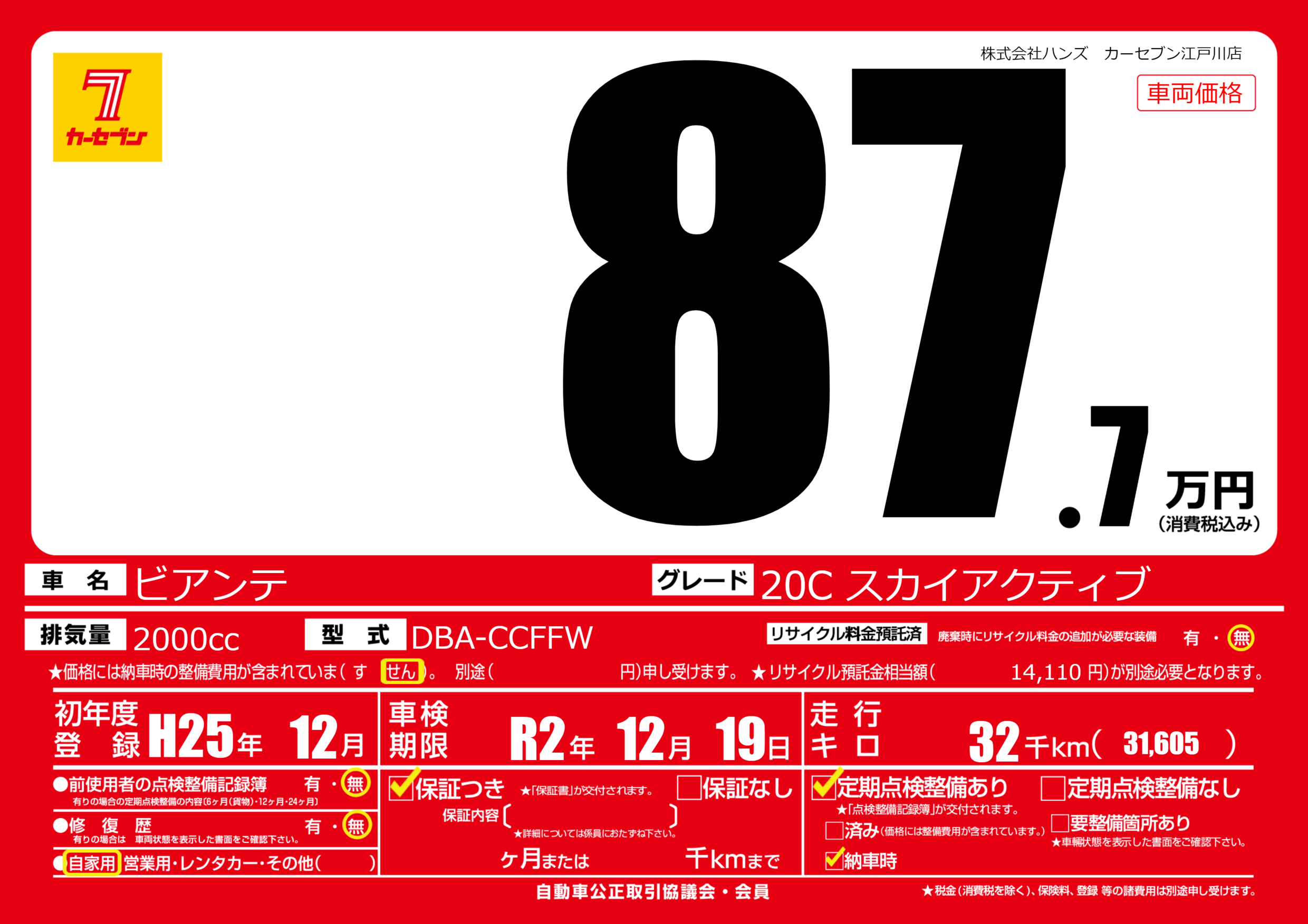 | 定期点検整備 | 定期点検整備あり 納車時あり | ||