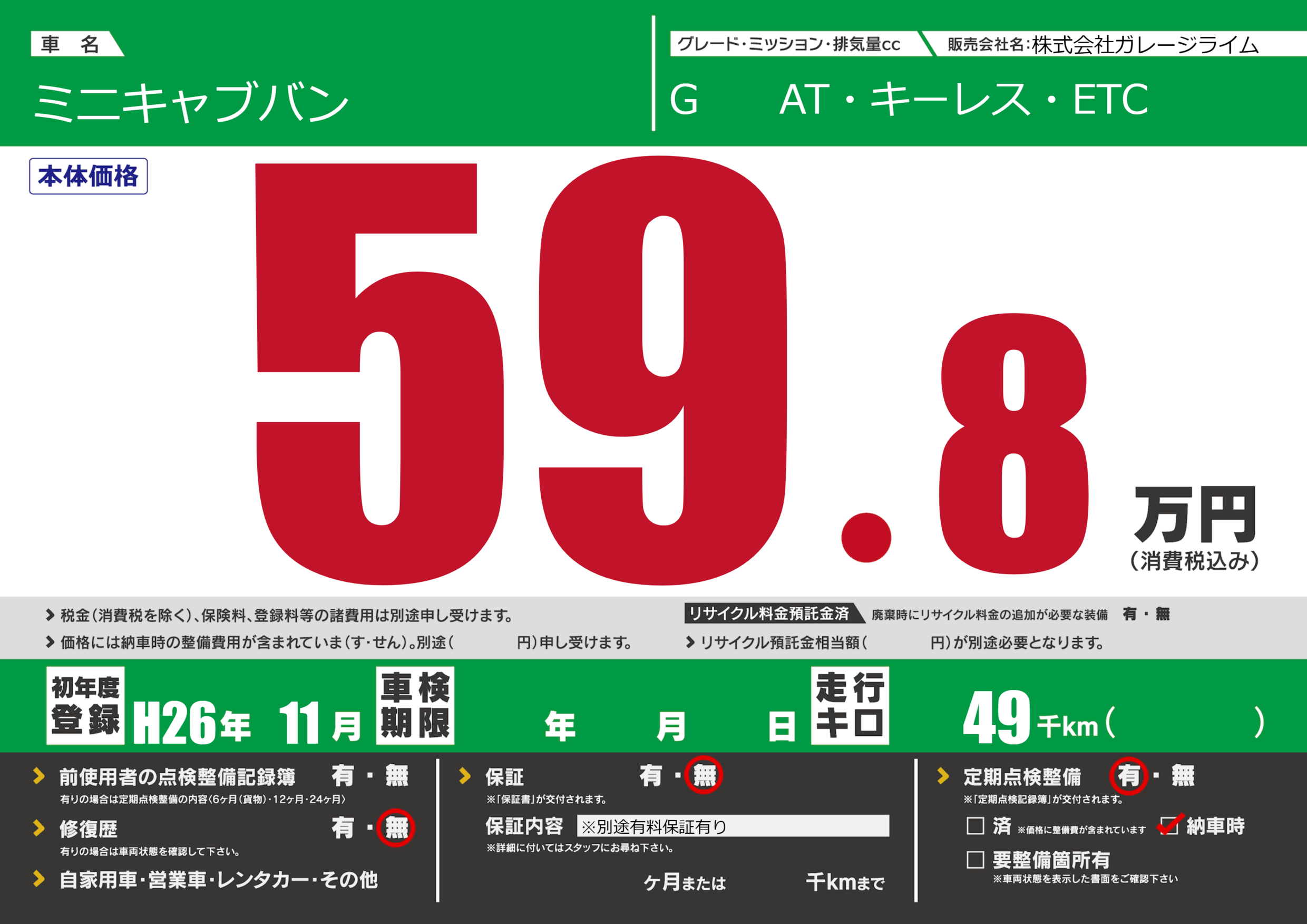 | 車名 | ミニキャブバン | グレード ミッション 排気量 |