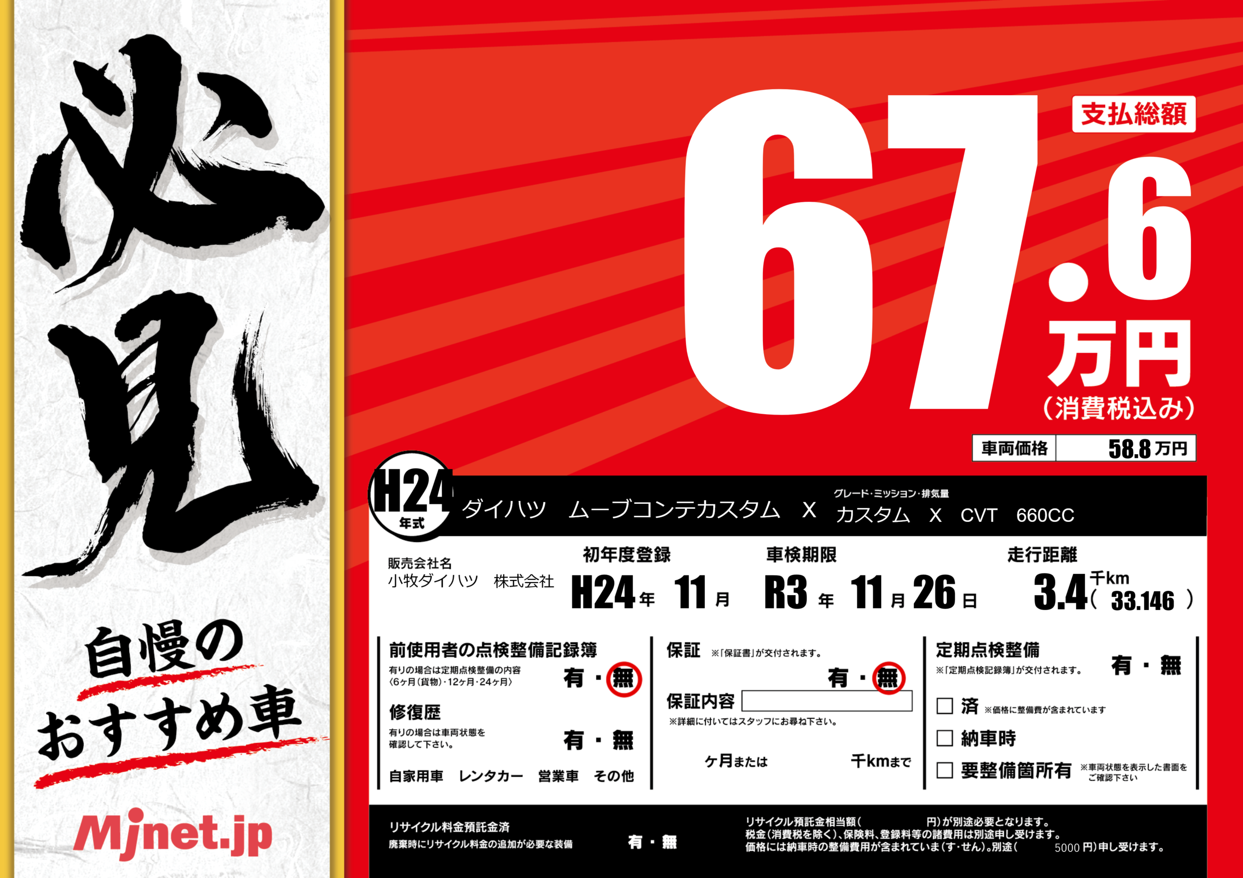 | 車名 | ダイハツ ムーブコンテカスタム X | グレード ミッション 排気量 |