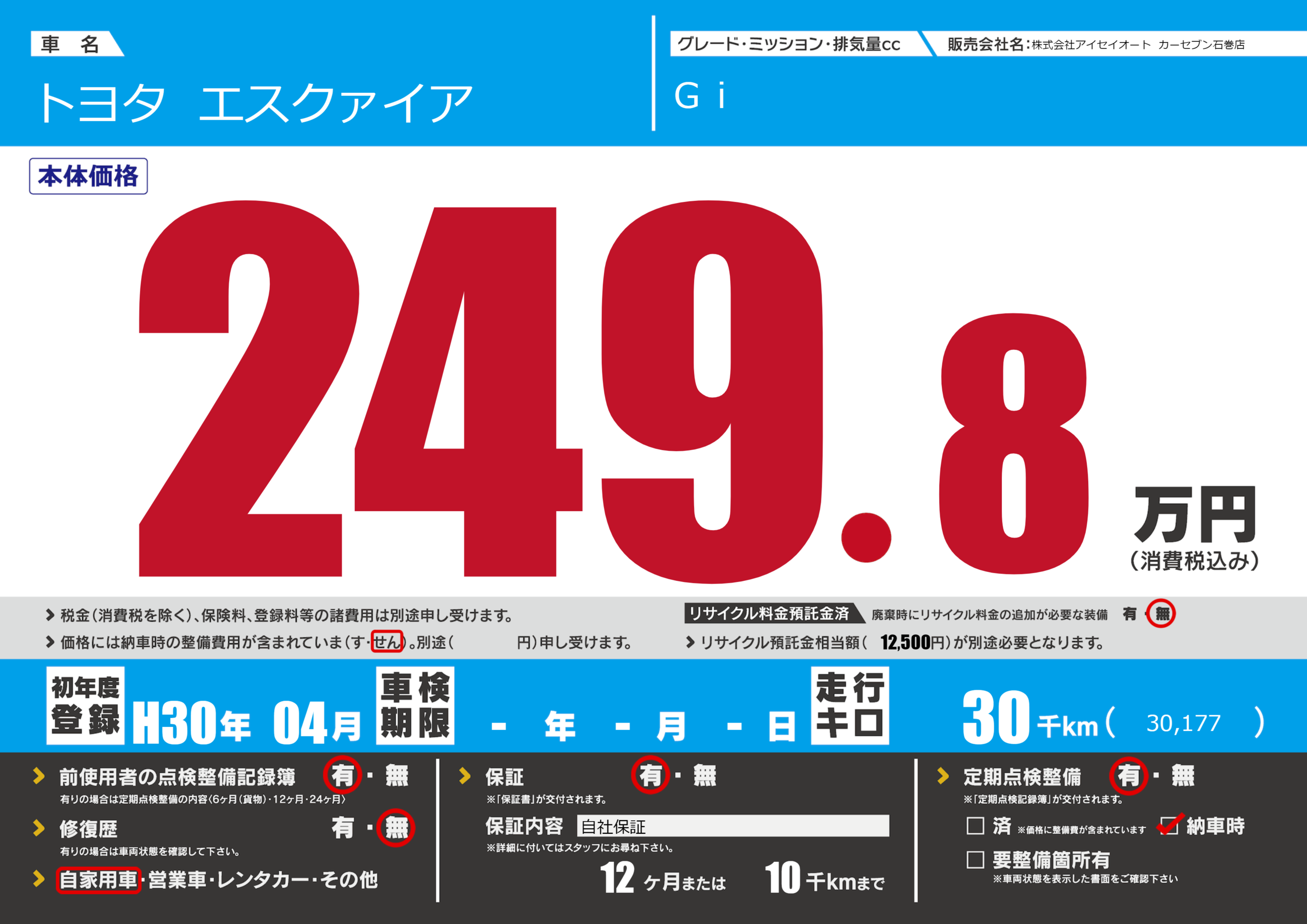 | 車名 | トヨタ エスクァイア | グレード ミッション 排気量 |