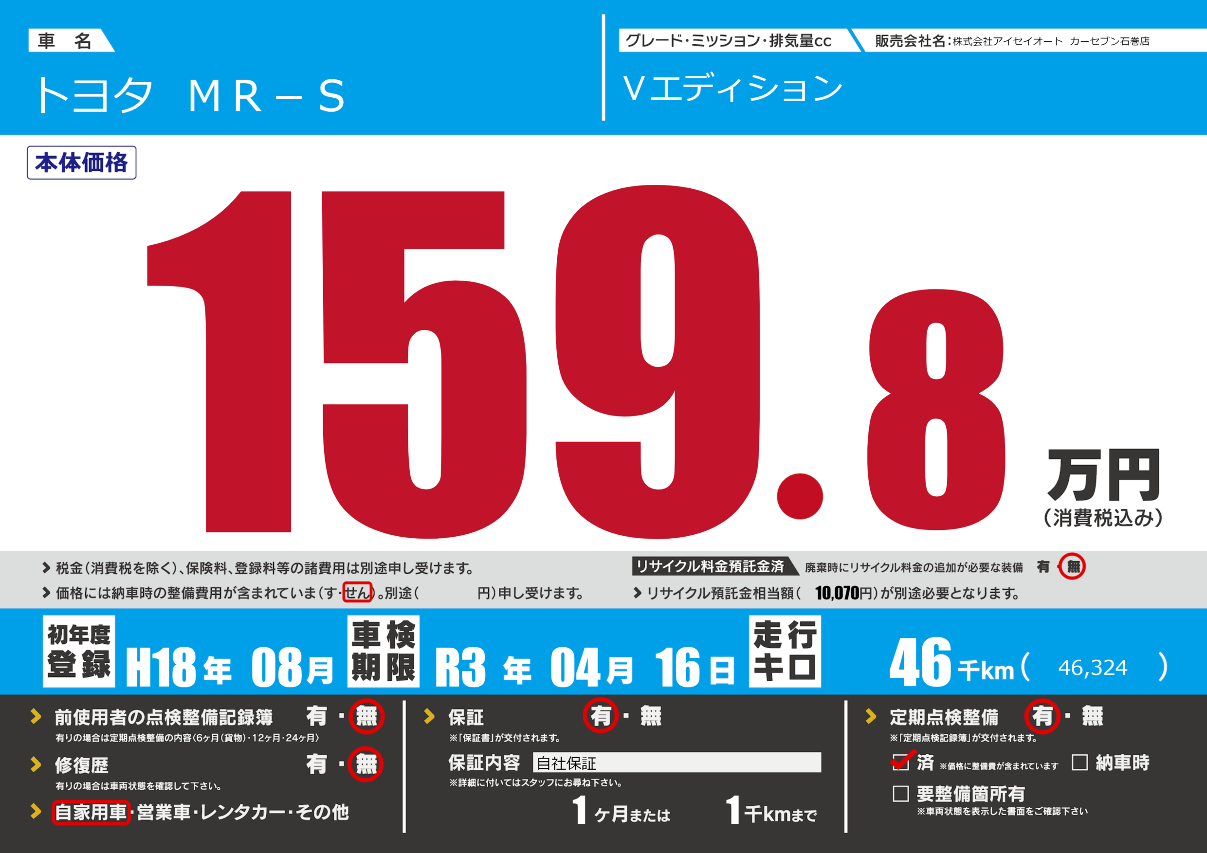 | 定期点検整備 | 定期点検整備あり 定期点検整備済み | ||