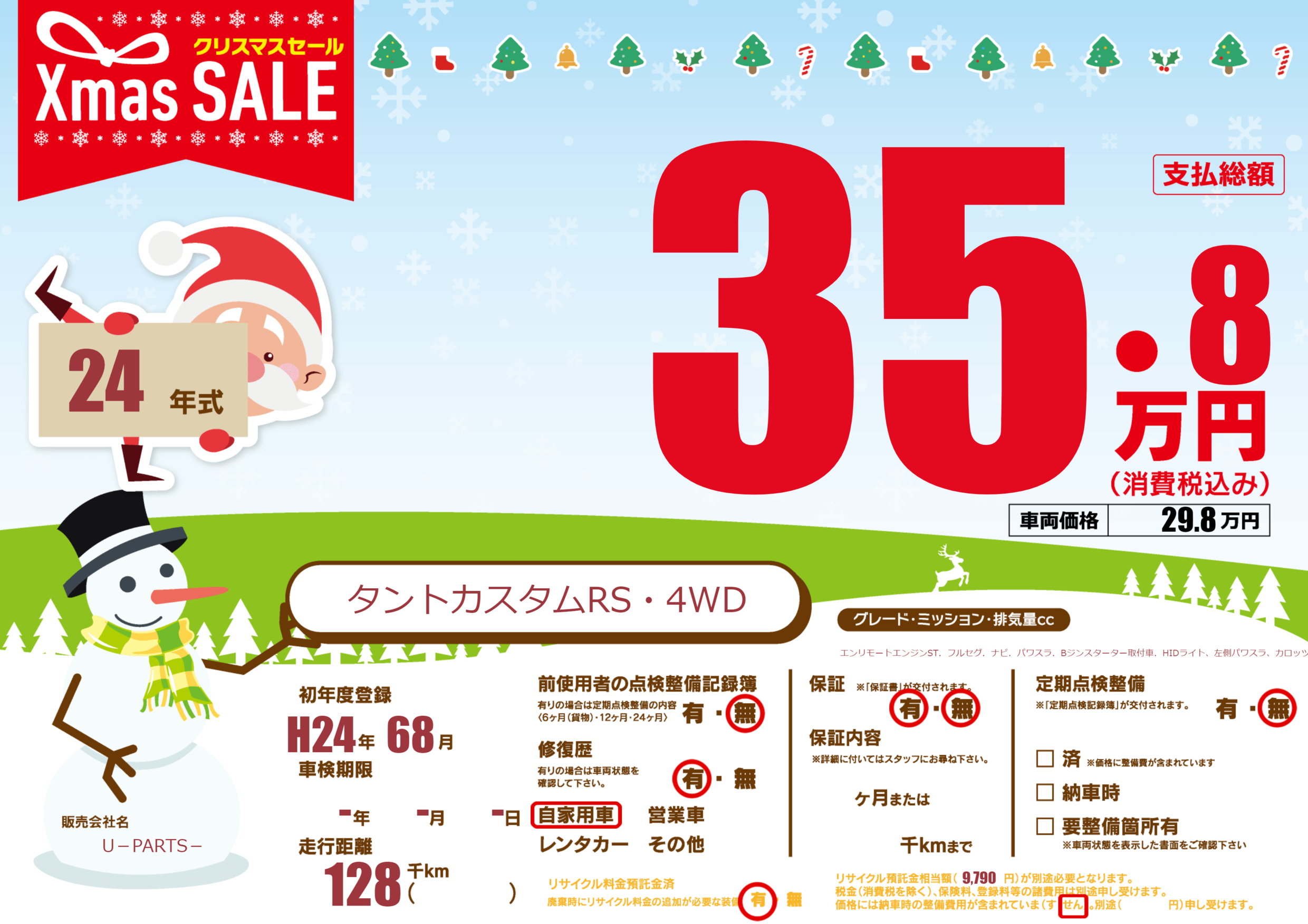 | 車名 | タントカスタムRS・4WD | グレード ミッション 排気量 |