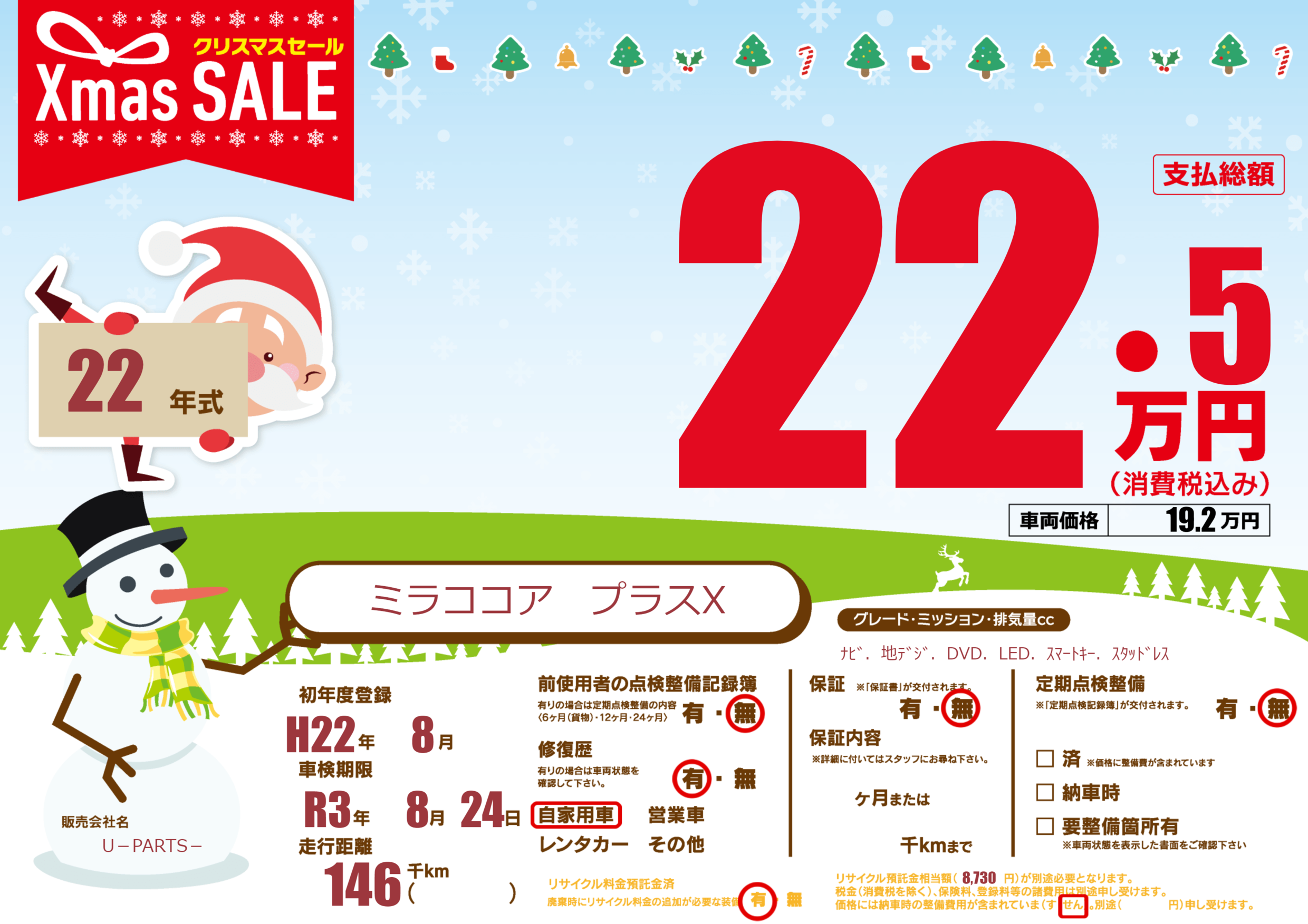| 走行キロ | 14.6万km | 初年度登録 | H22年8月 |