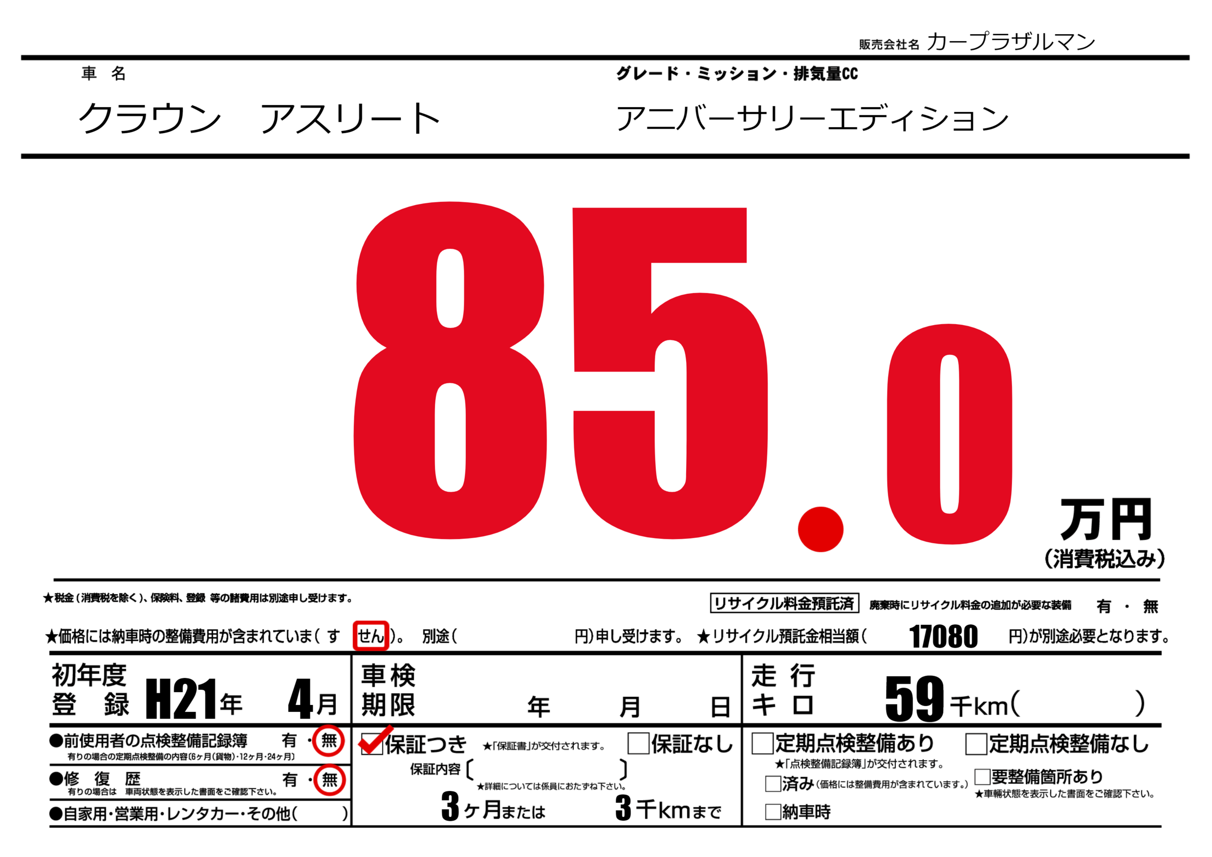| 車名 | クラウン アスリート | グレード ミッション 排気量 |