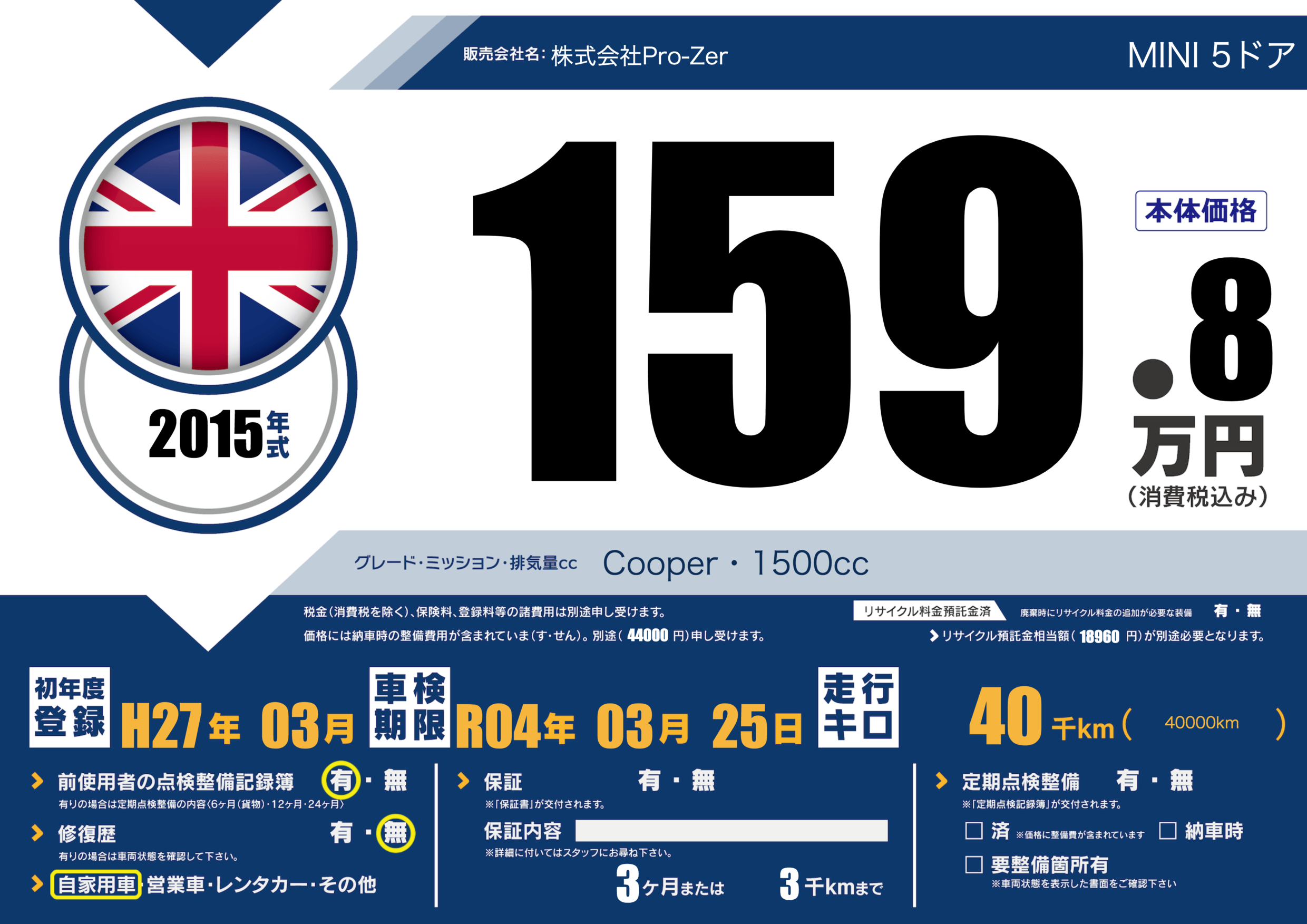 | 車名 | MINI 5ドア | グレード ミッション 排気量 |
