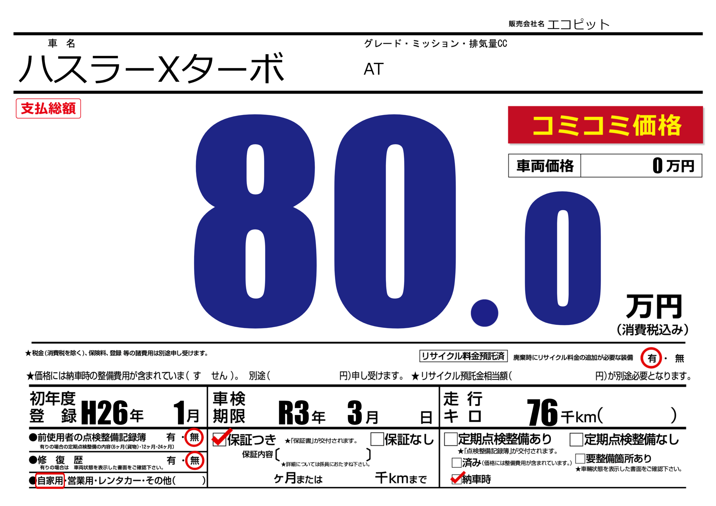 | 車名 | ハスラーXターボ | グレード ミッション 排気量 |