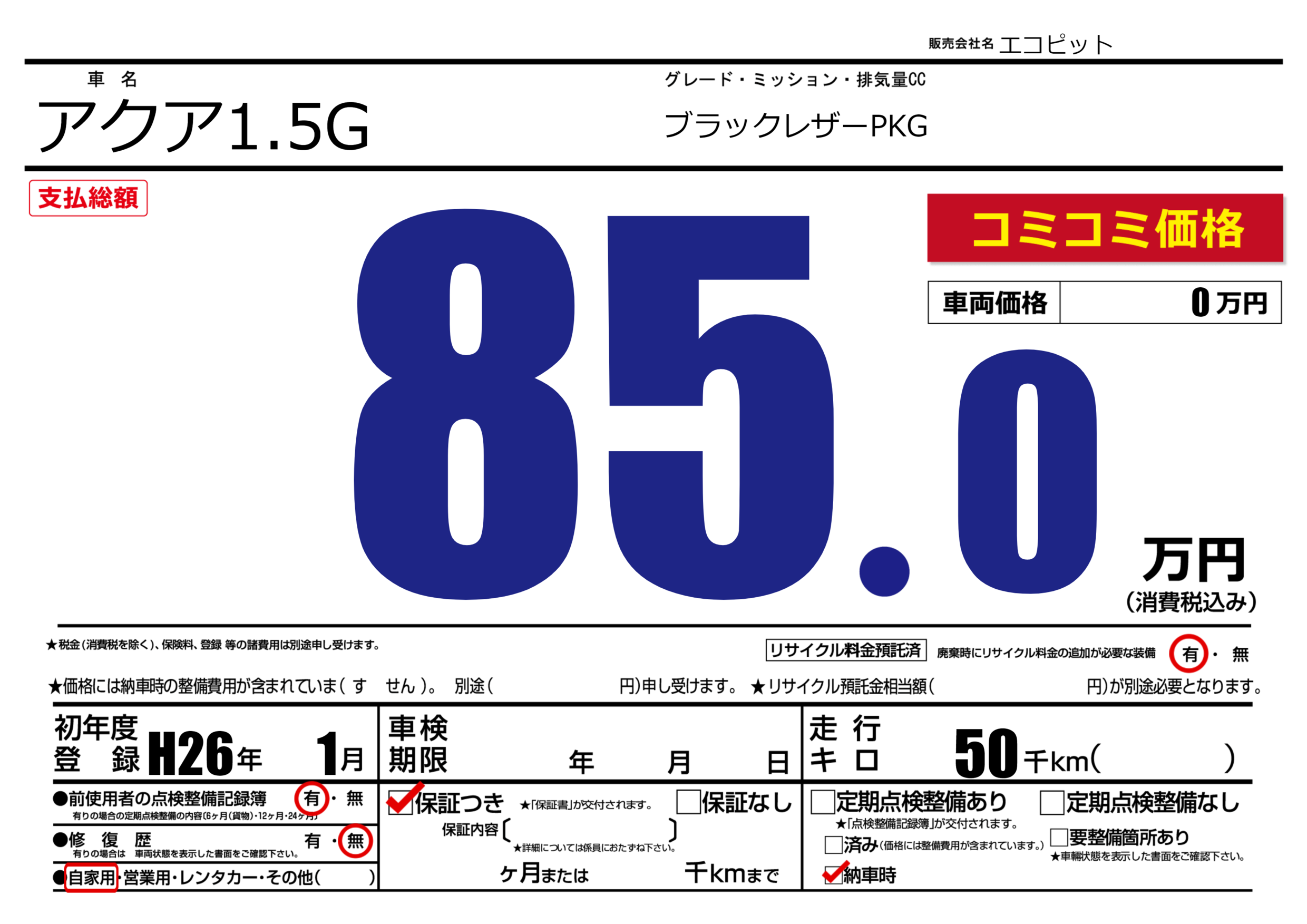 | 車名 | アクア1.5G | グレード ミッション 排気量 |