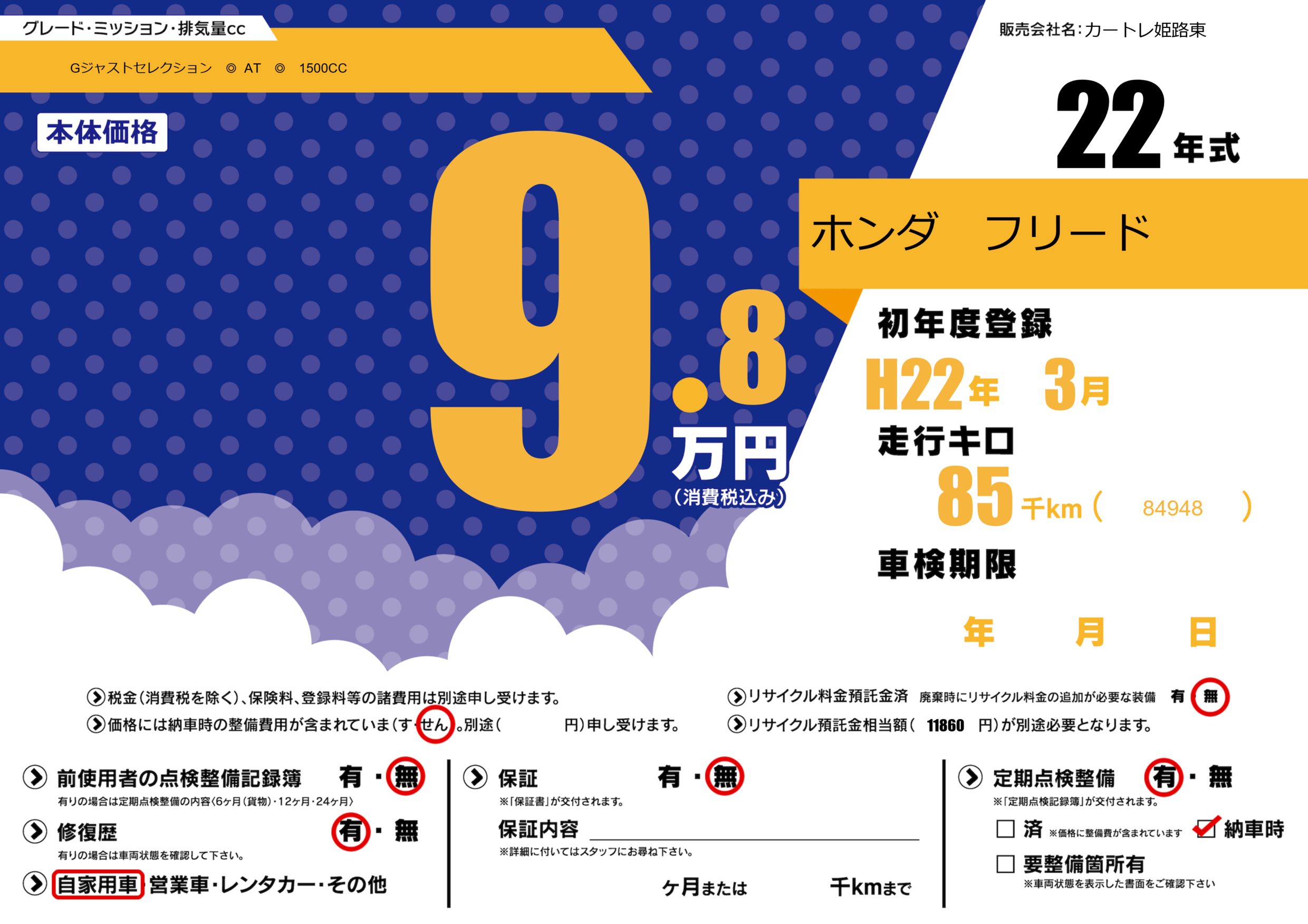 | 走行キロ | 8.5万km | 初年度登録 | H22年3月 |