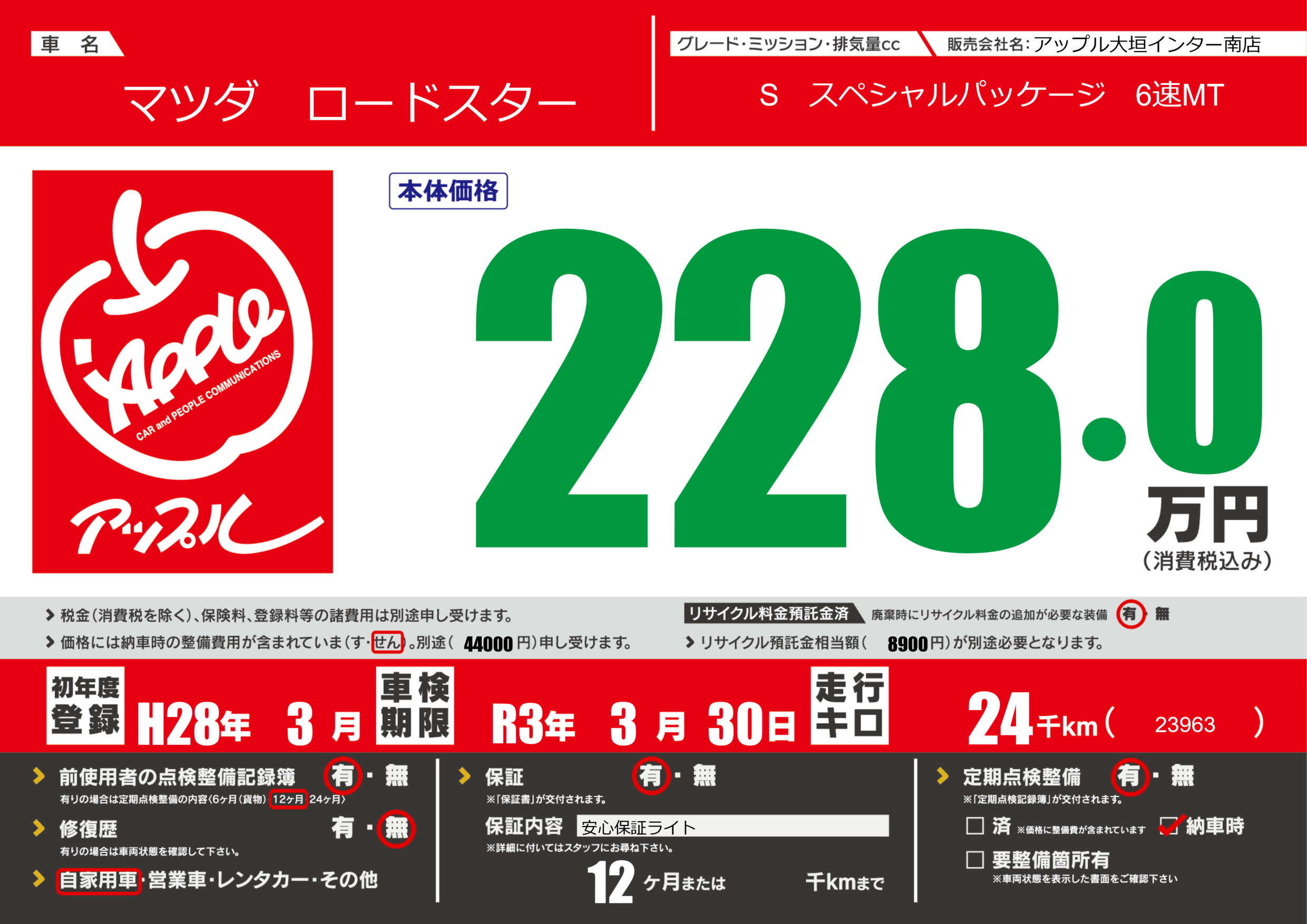 | 車名 | マツダ ロードスター | グレード ミッション 排気量 |