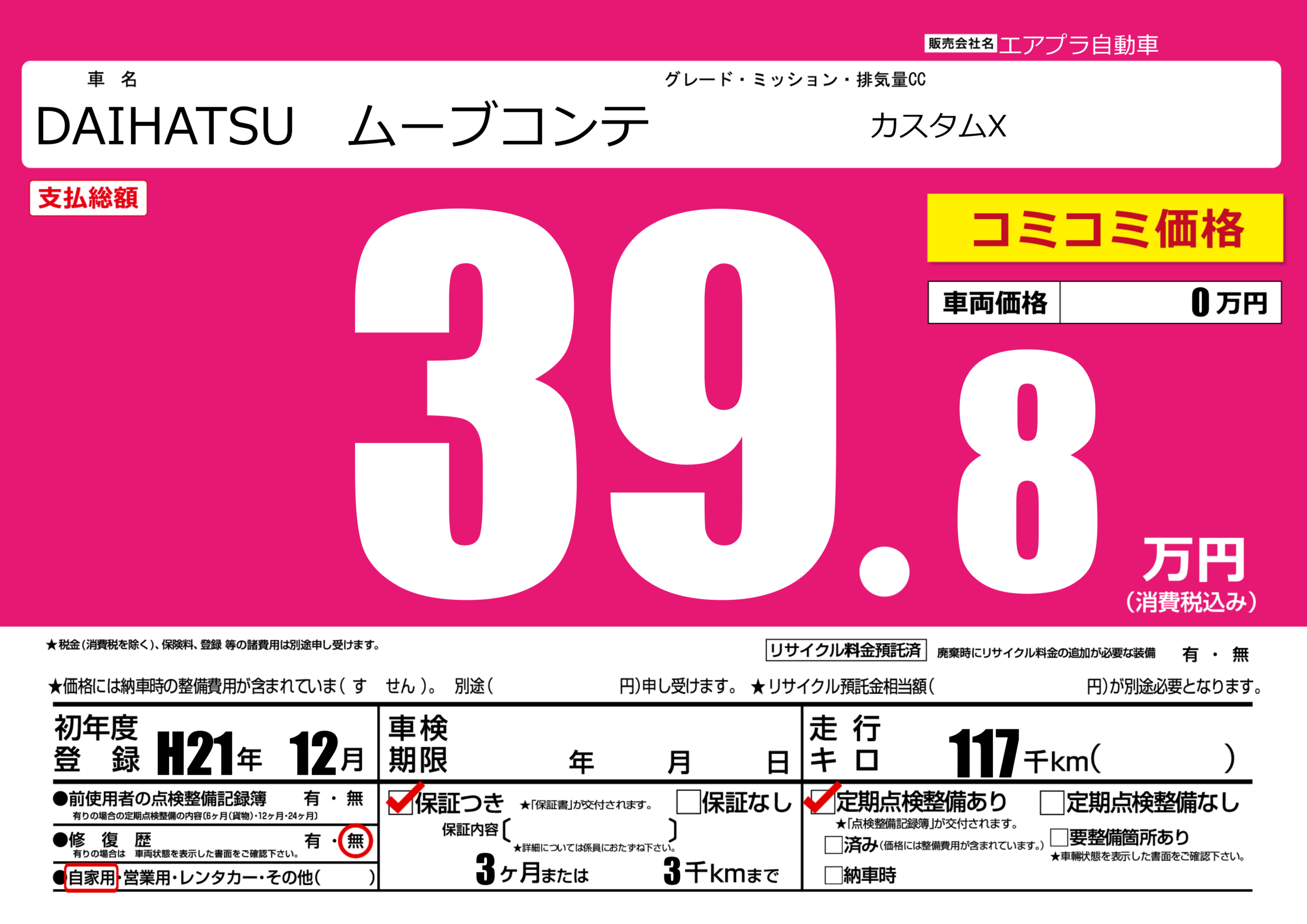 保証付き 保証内容(---) 3ヶ月または(3)千kmまで |