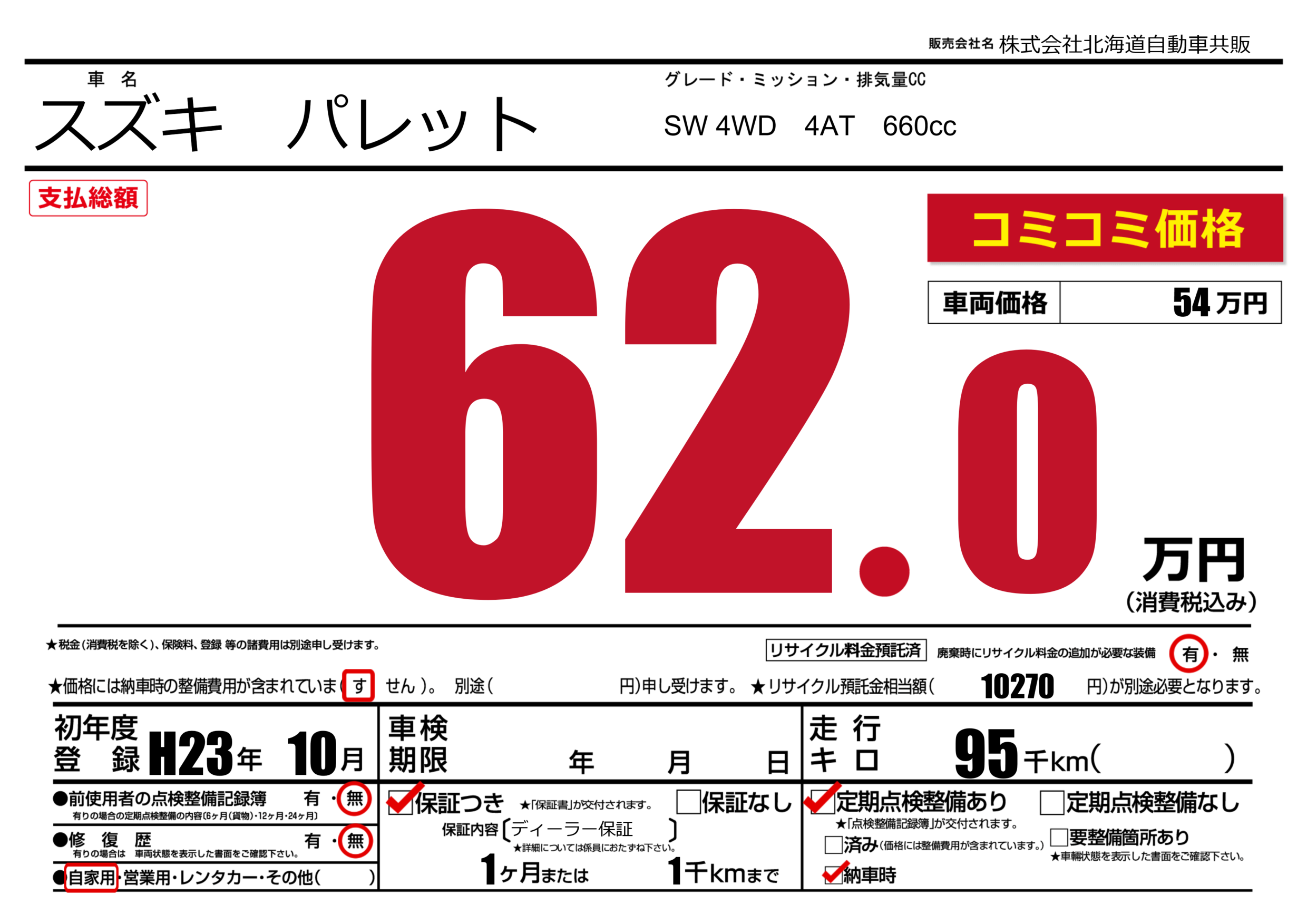 | 走行キロ | 9.5万km | 初年度登録 | H23年10月 |