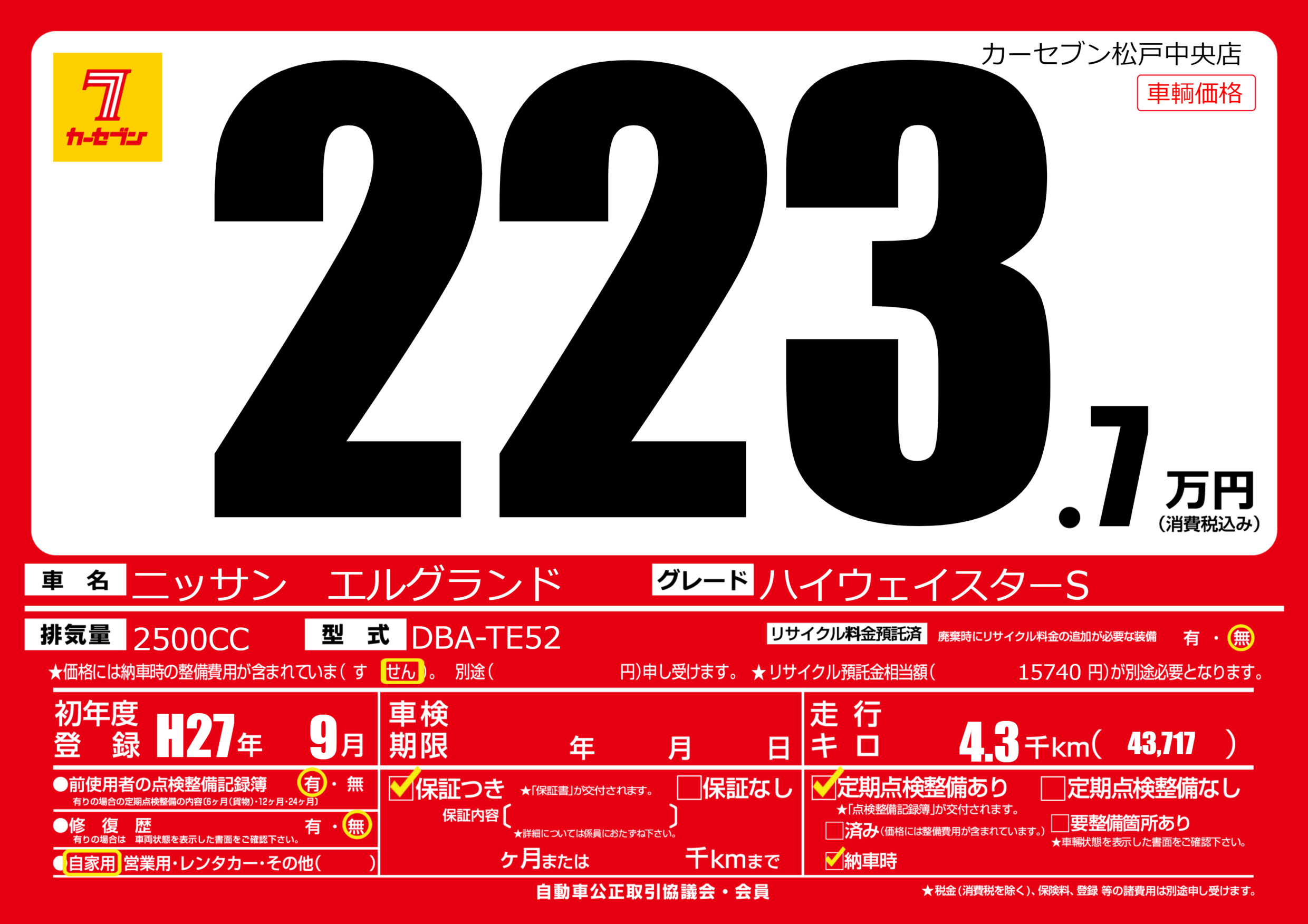 | 車名 | ニッサン エルグランド | グレード ミッション 排気量 |