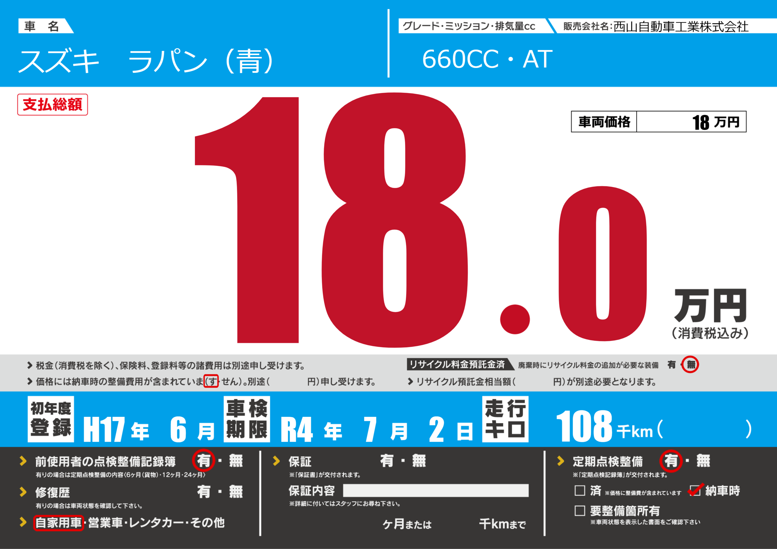 | 走行キロ | 10.8万km | 初年度登録 | H17年6月 |