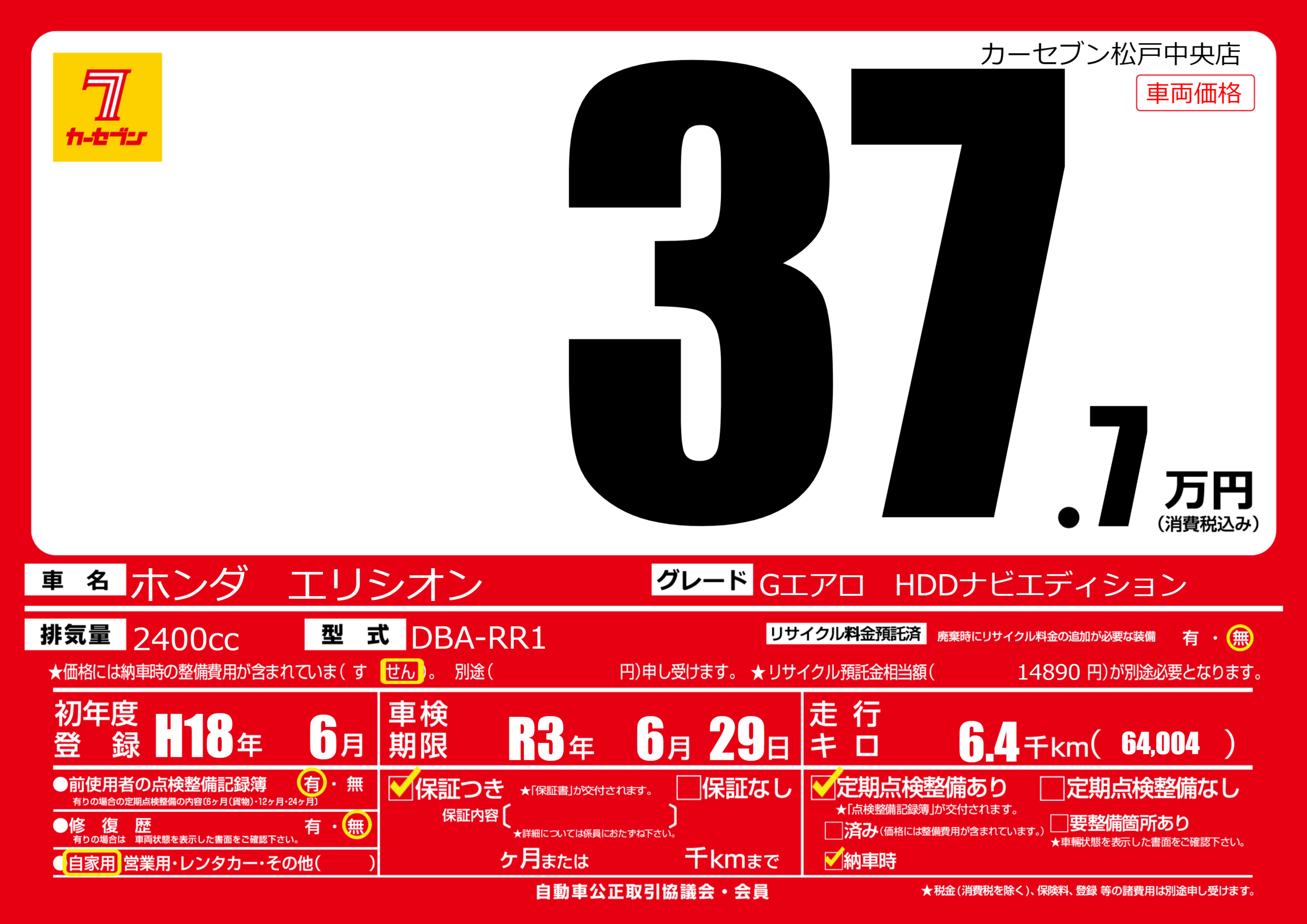 | 車名 | ホンダ エリシオン | グレード ミッション 排気量 |