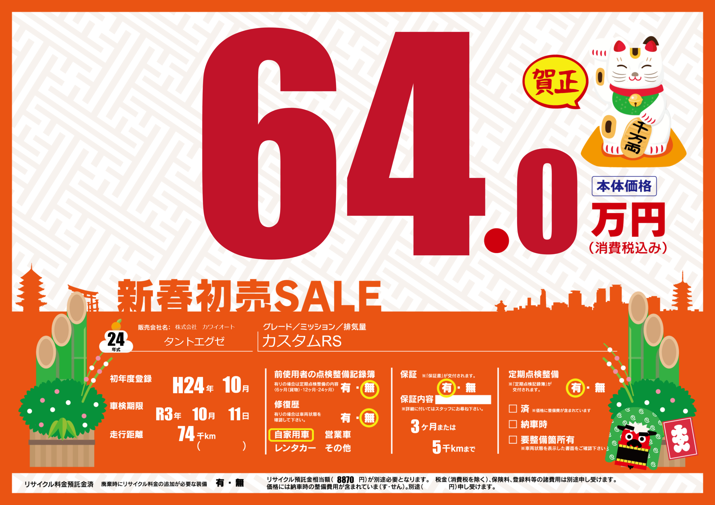 | 走行キロ | 7.4万km | 初年度登録 | H24年10月 |