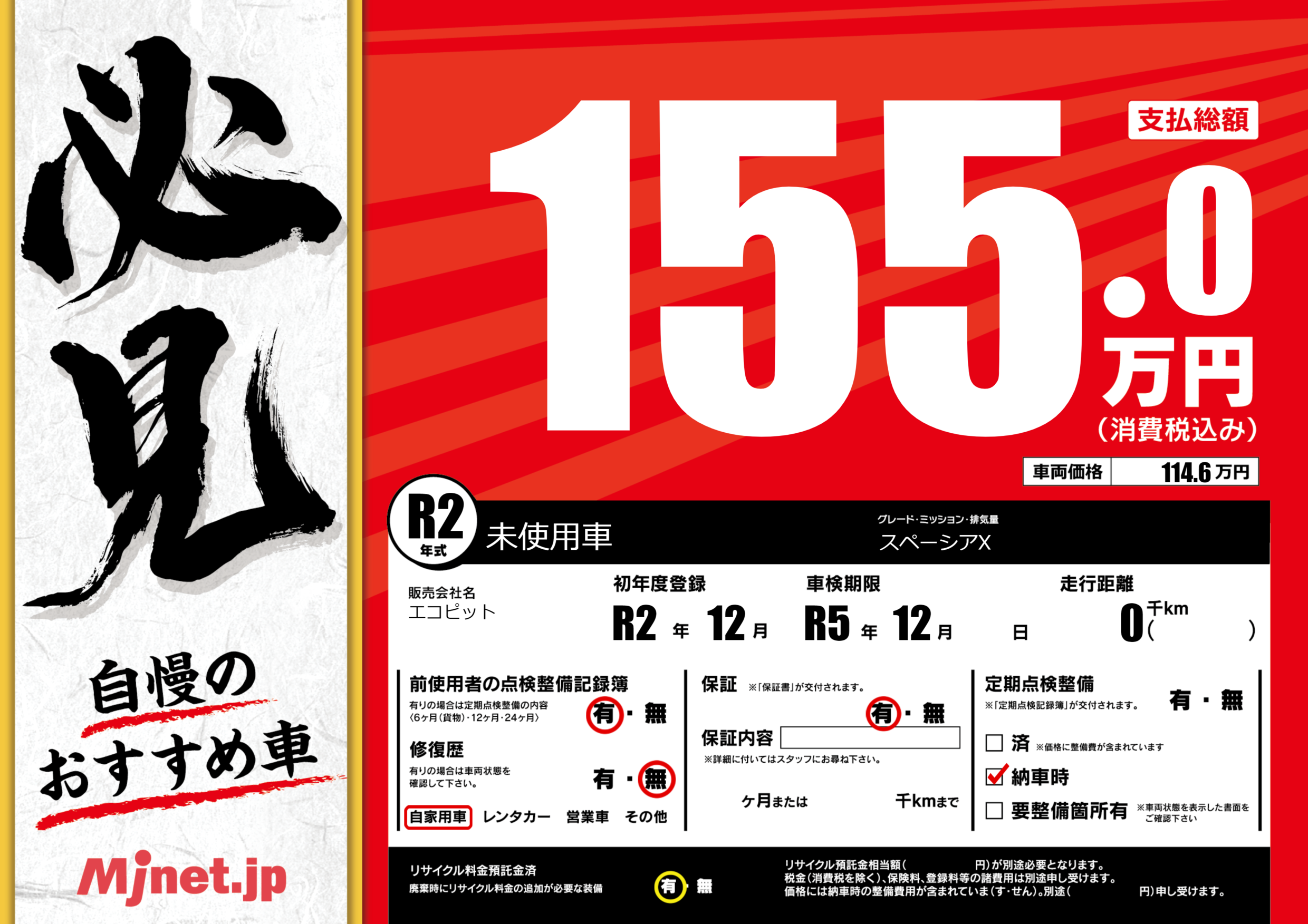 | 走行キロ | - | 初年度登録 | R2年12月 |