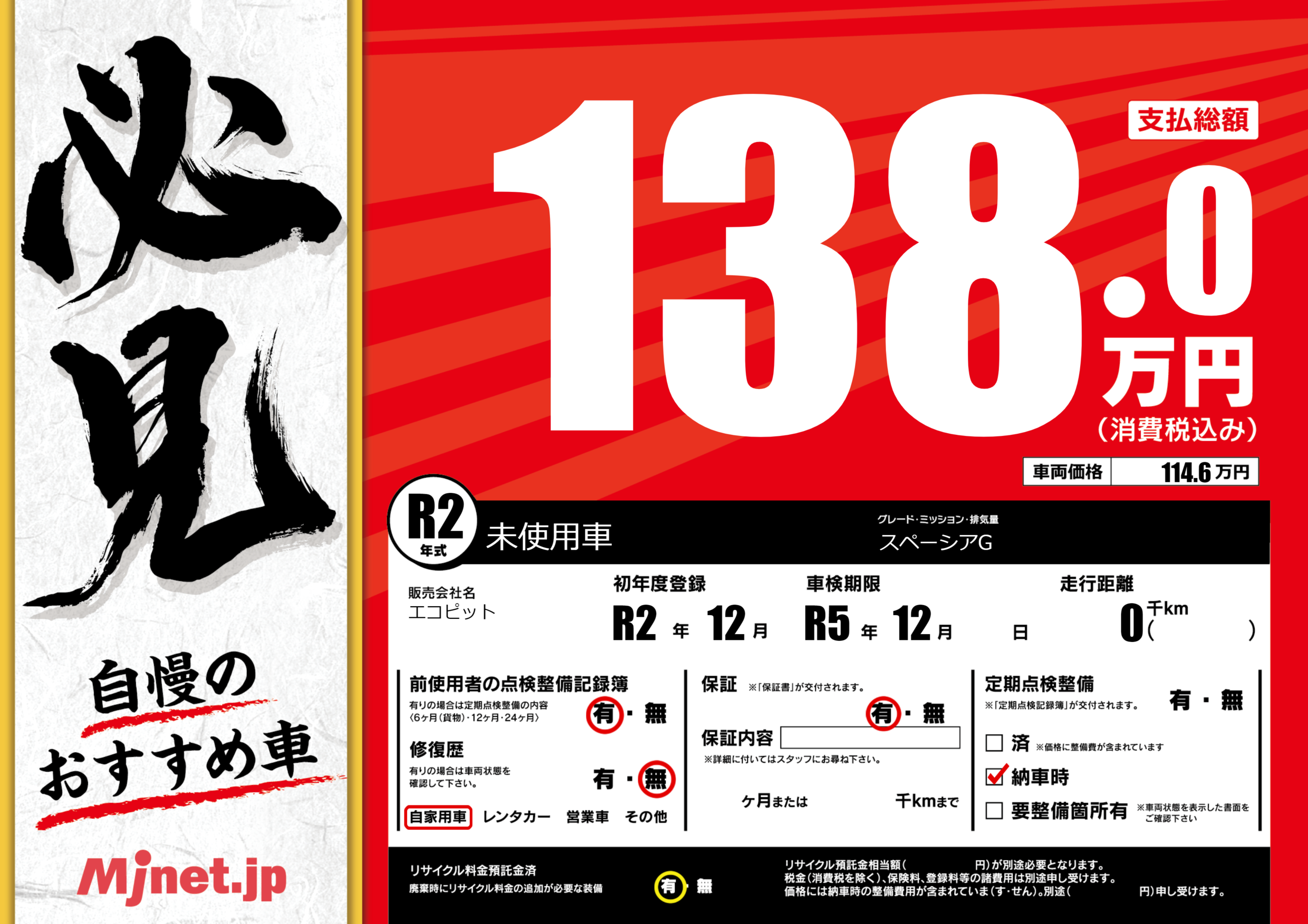 | 車名 | 未使用車 | グレード ミッション 排気量 |