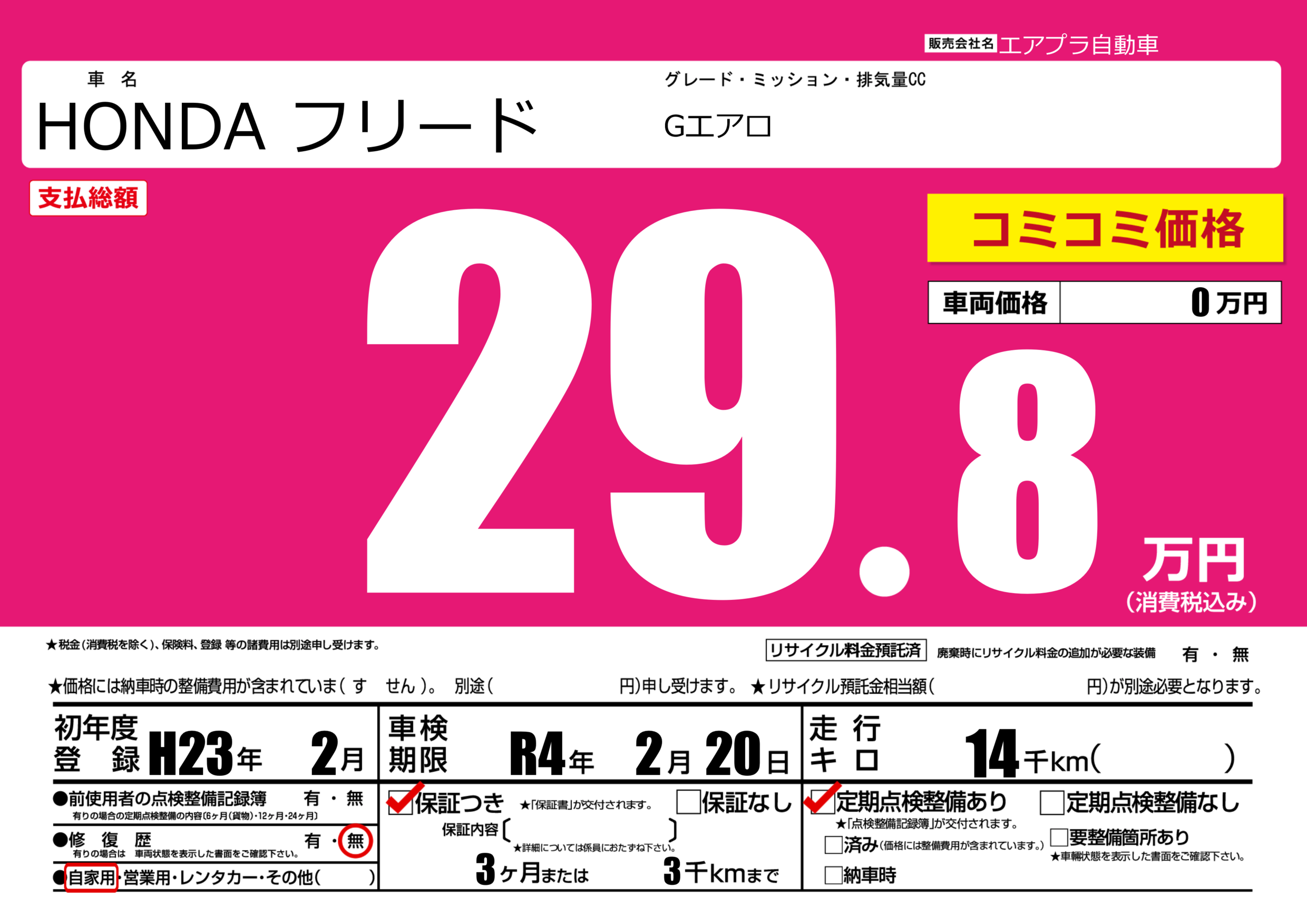| 車名 | HONDA フリード | グレード ミッション 排気量 |