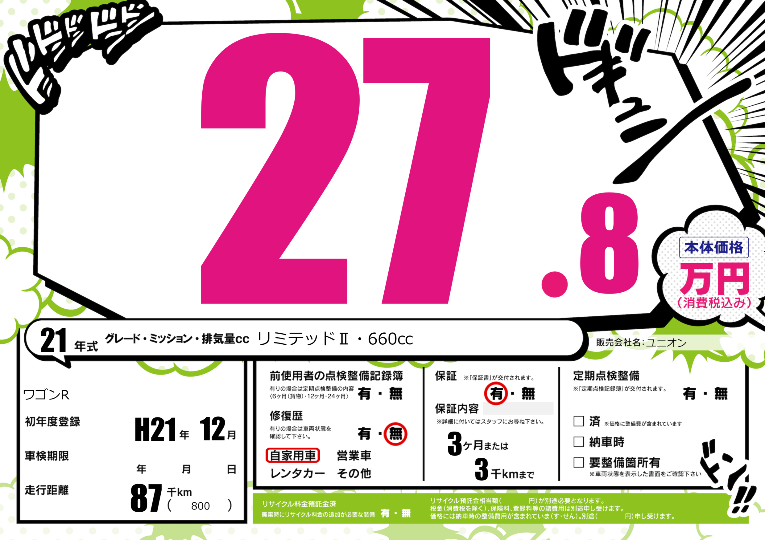 | 走行キロ | 8.7万km | 初年度登録 | H21年12月 |