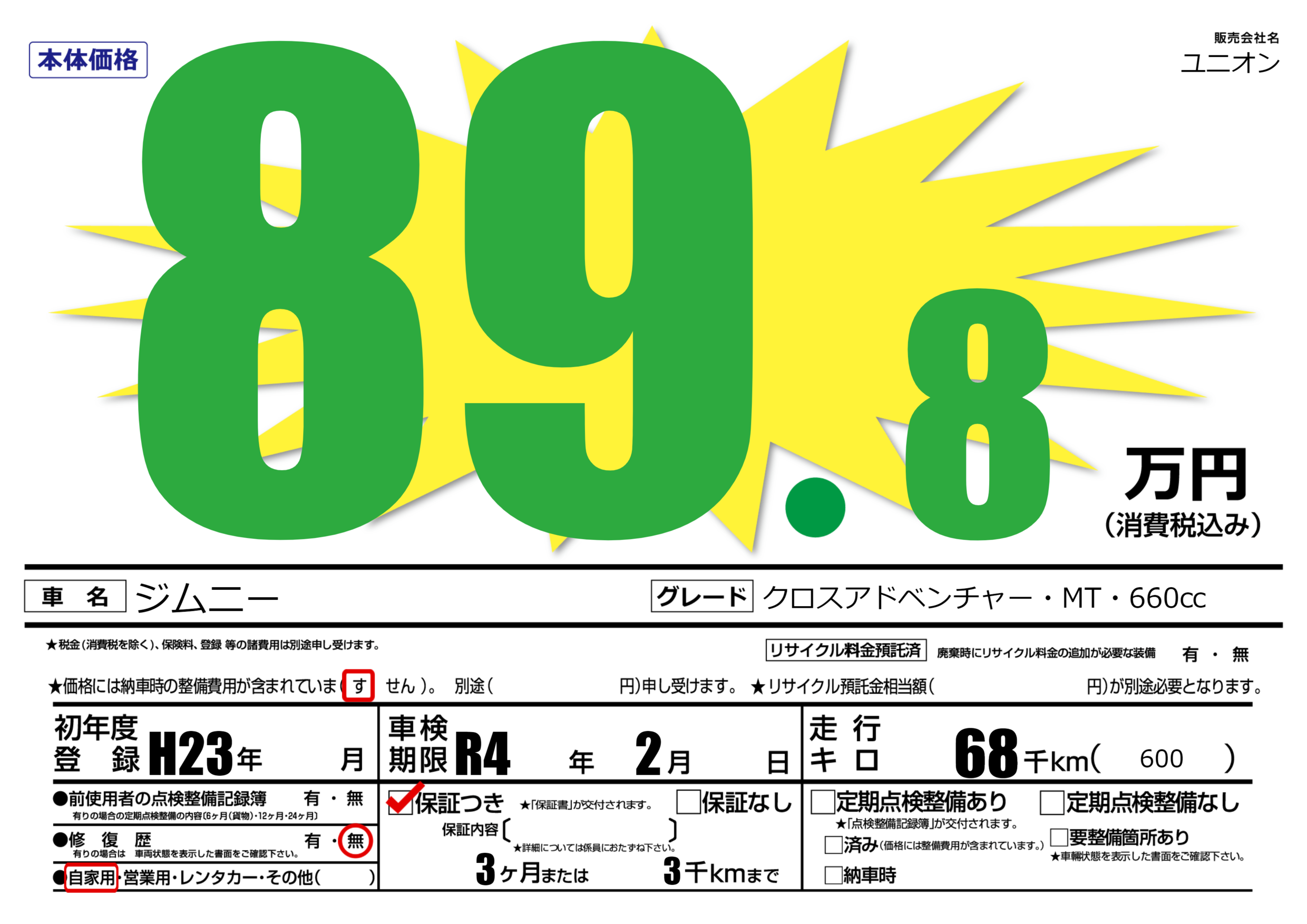 保証付き 保証内容(---) 3ヶ月または(3)千kmまで |