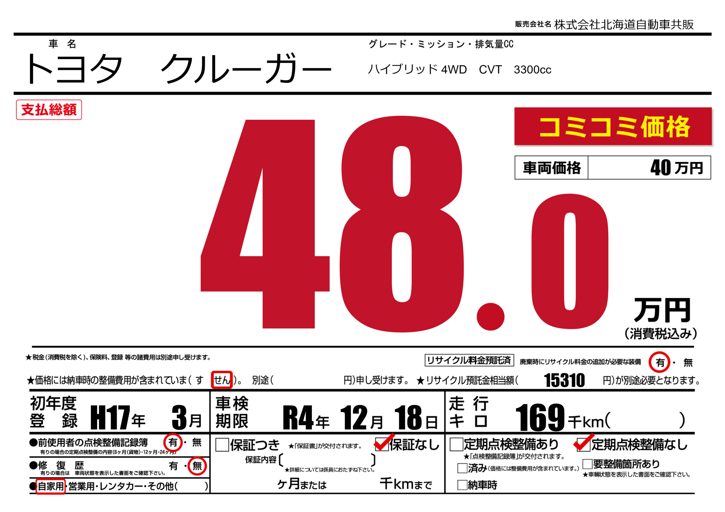 | 車名 | トヨタ クルーガー | グレード ミッション 排気量 |