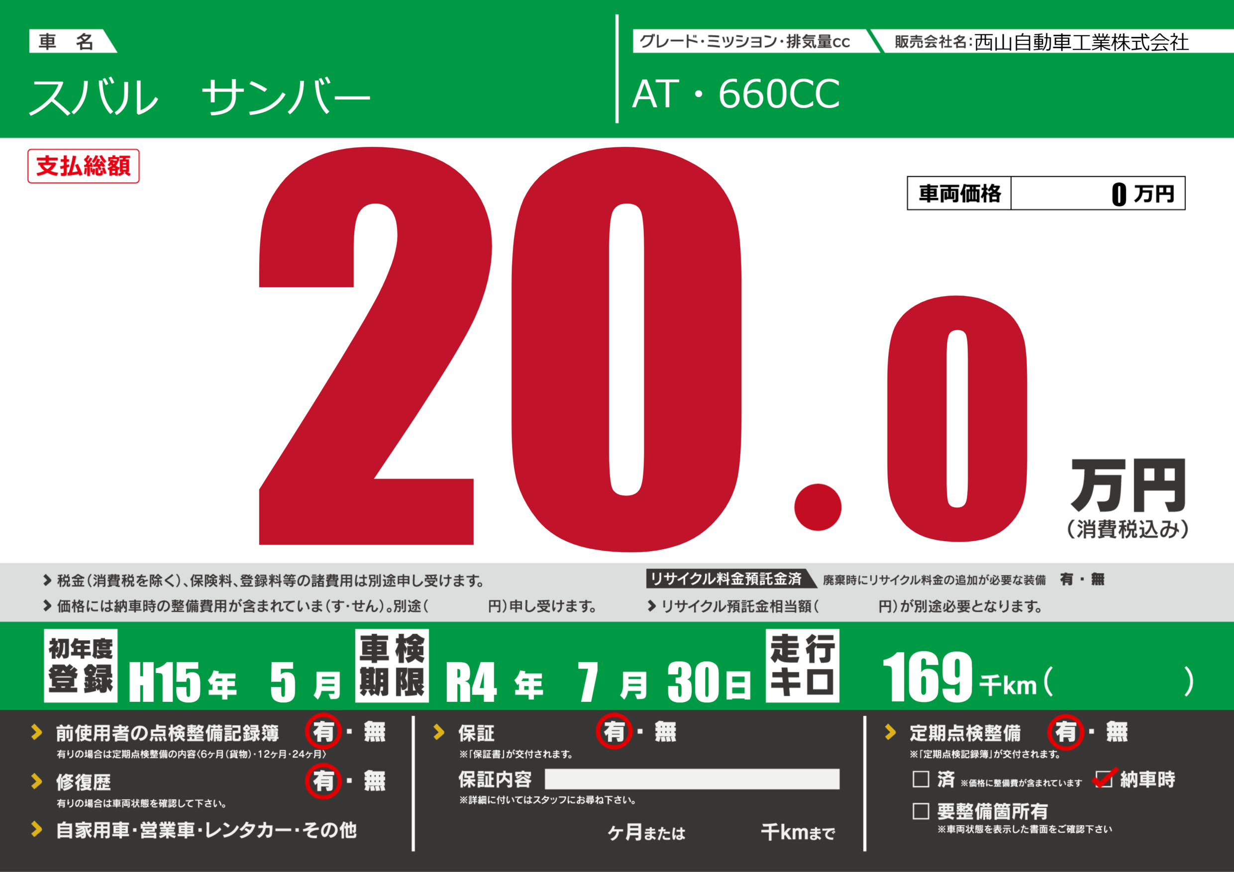 | 車名 | スバル サンバー | グレード ミッション 排気量 |