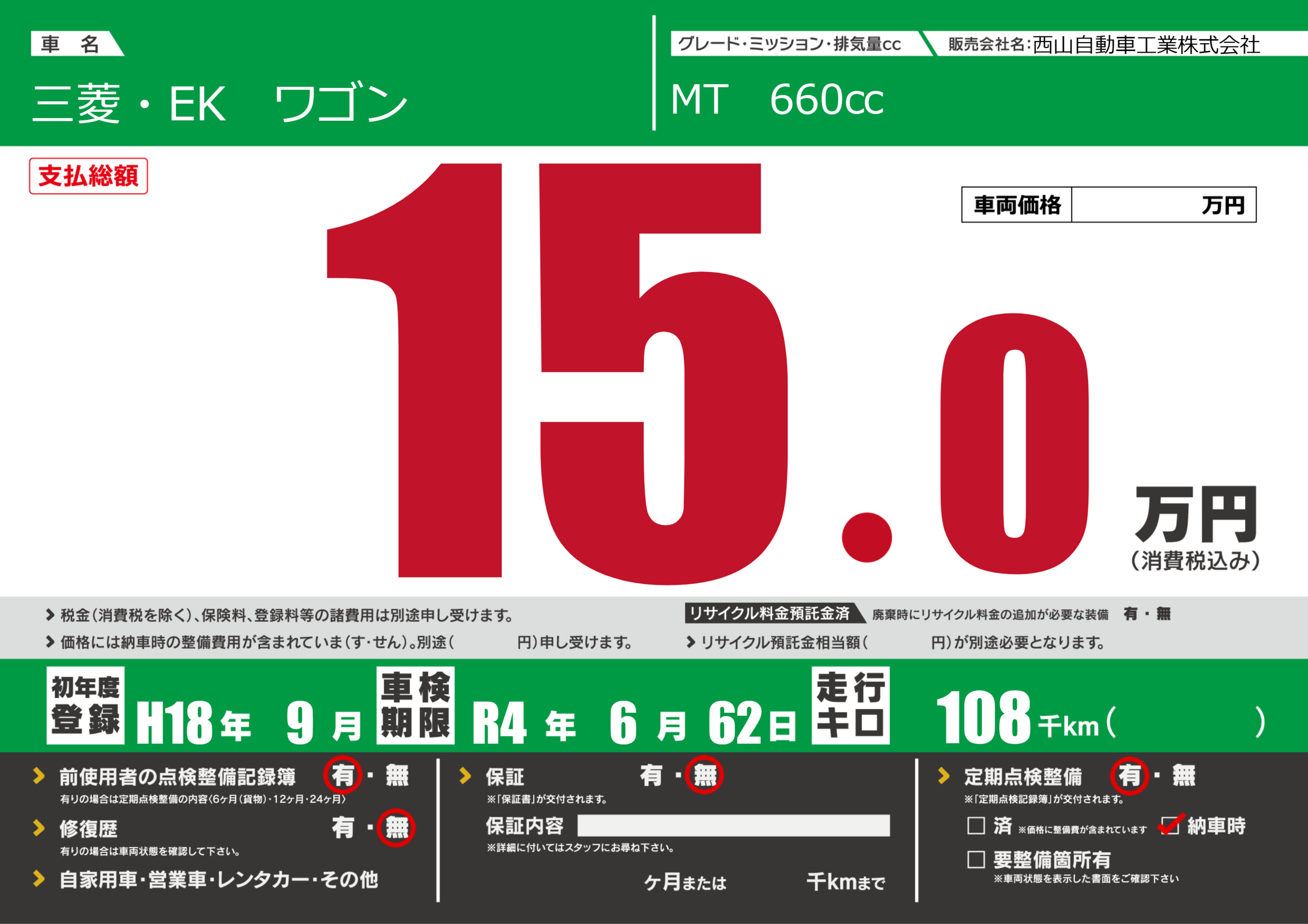 | 定期点検整備 | 定期点検整備あり 納車時あり | ||