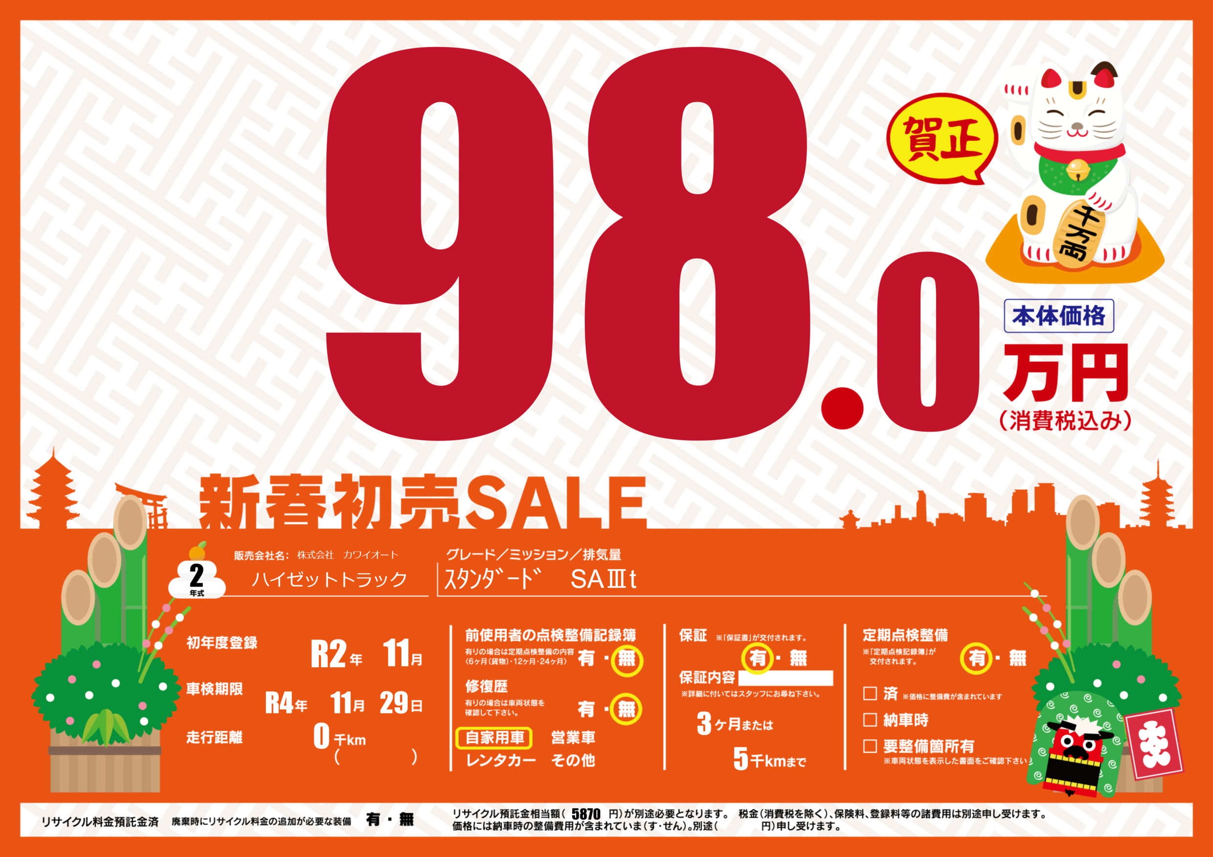 | 車名 | ハイゼットトラック | グレード ミッション 排気量 |