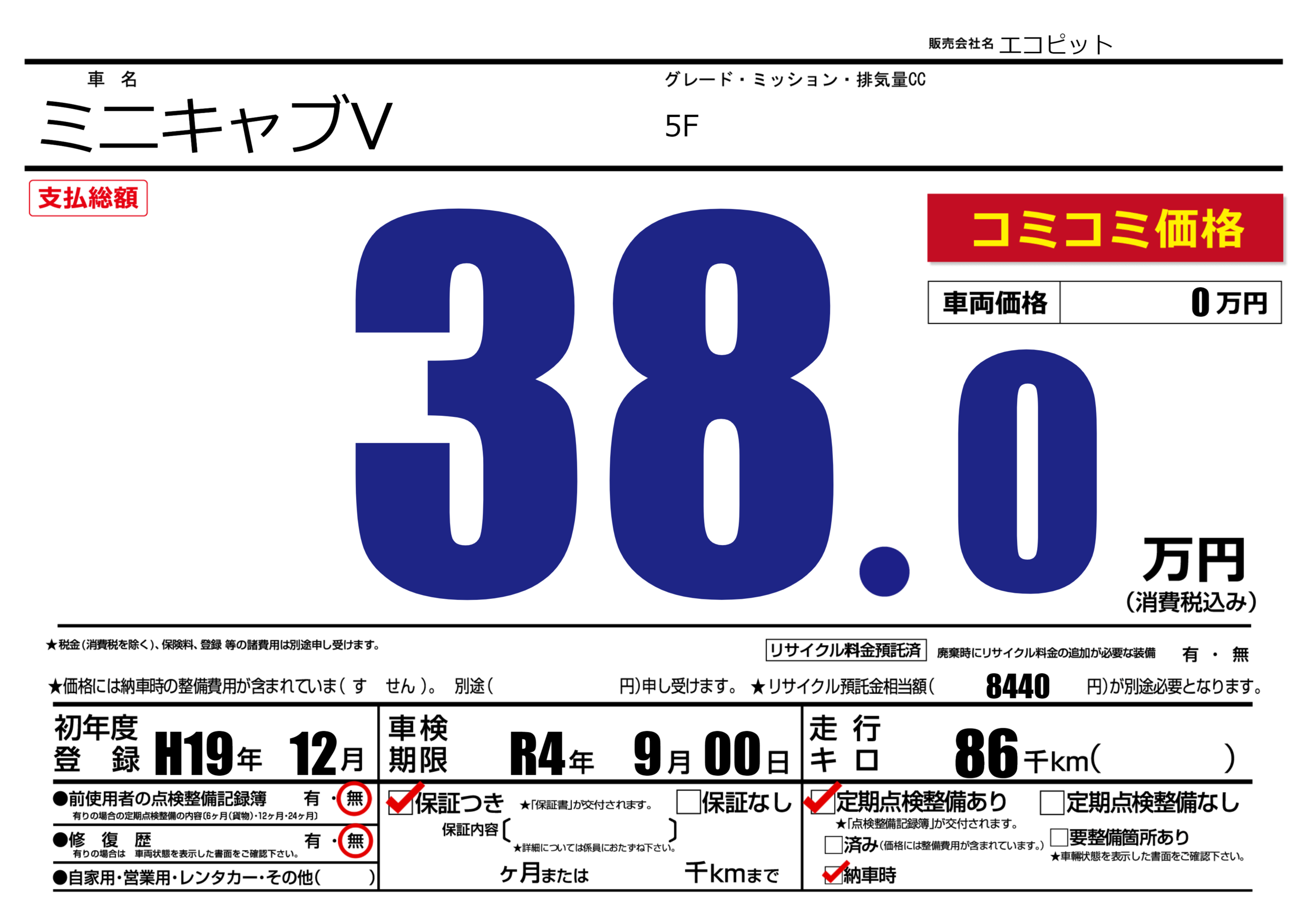 | 車名 | ミニキャブV | グレード ミッション 排気量 |