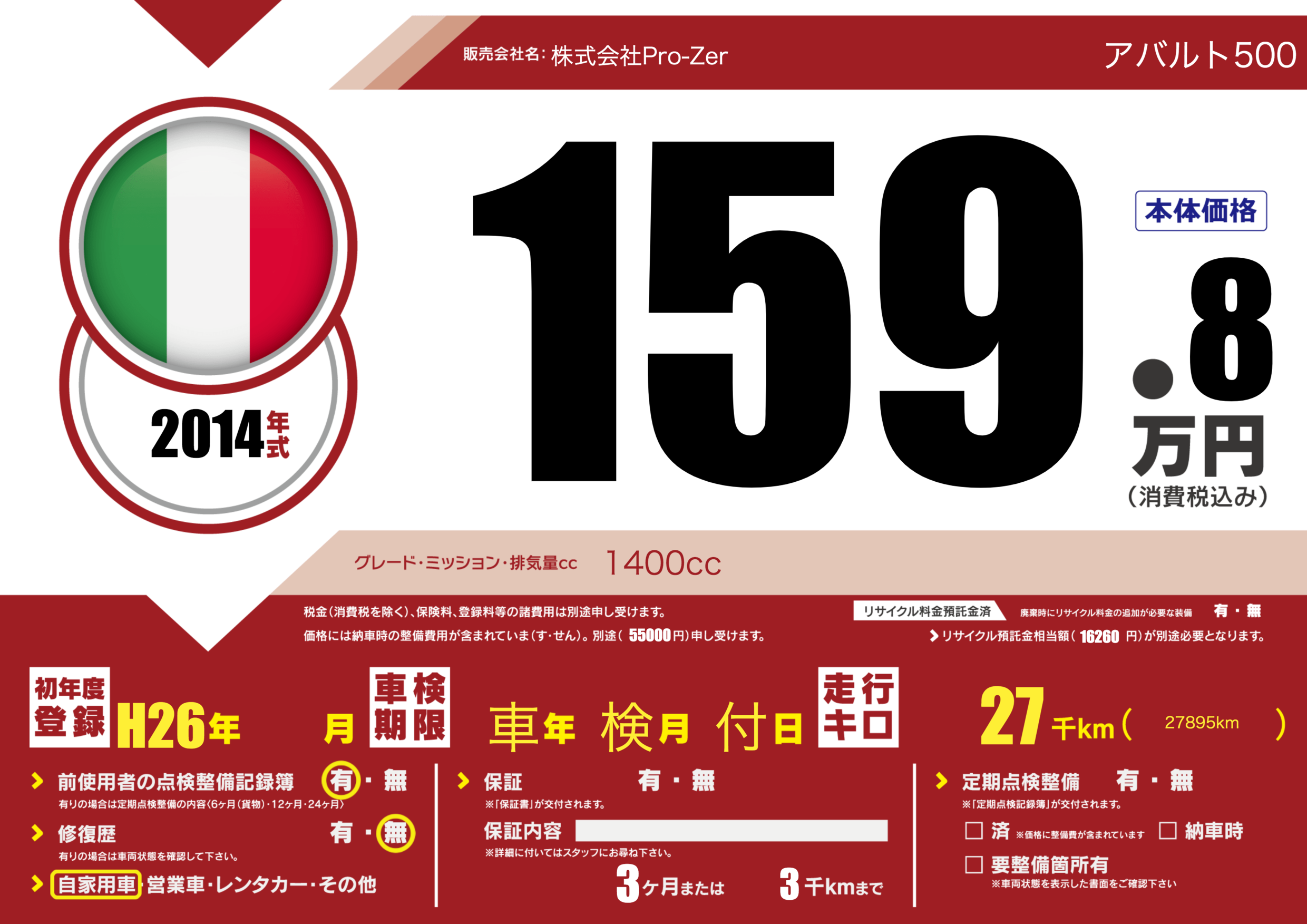 | 車名 | アバルト500 | グレード ミッション 排気量 |