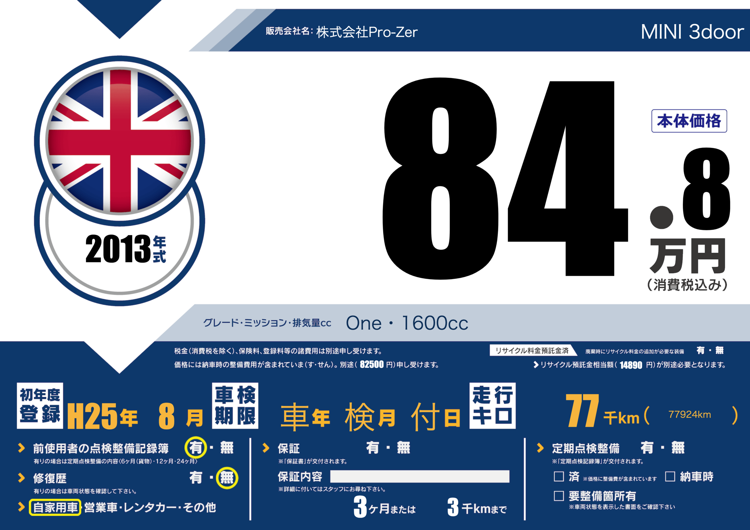 | 車名 | MINI 3door | グレード ミッション 排気量 |