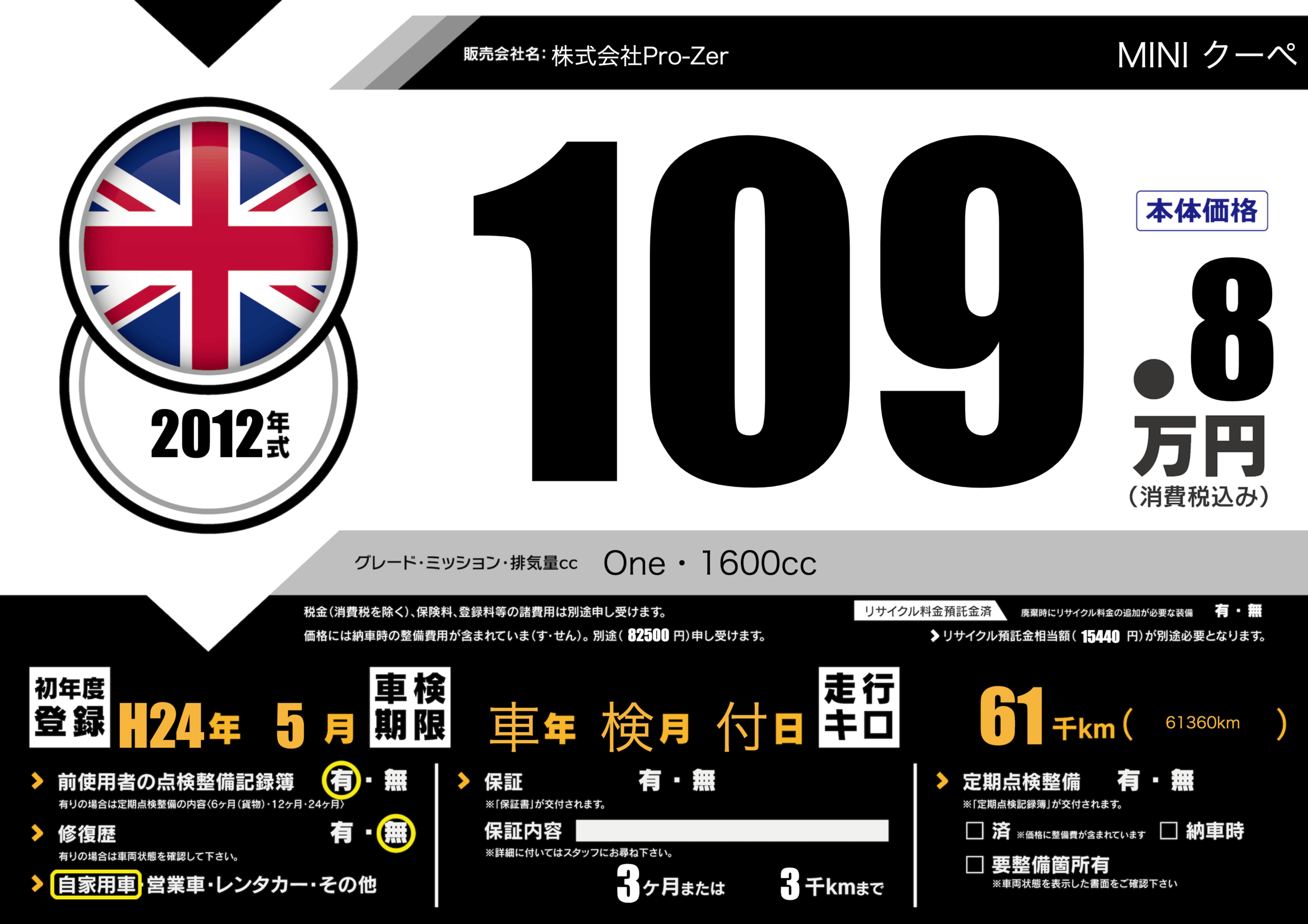 | 車名 | MINI クーぺ | グレード ミッション 排気量 |