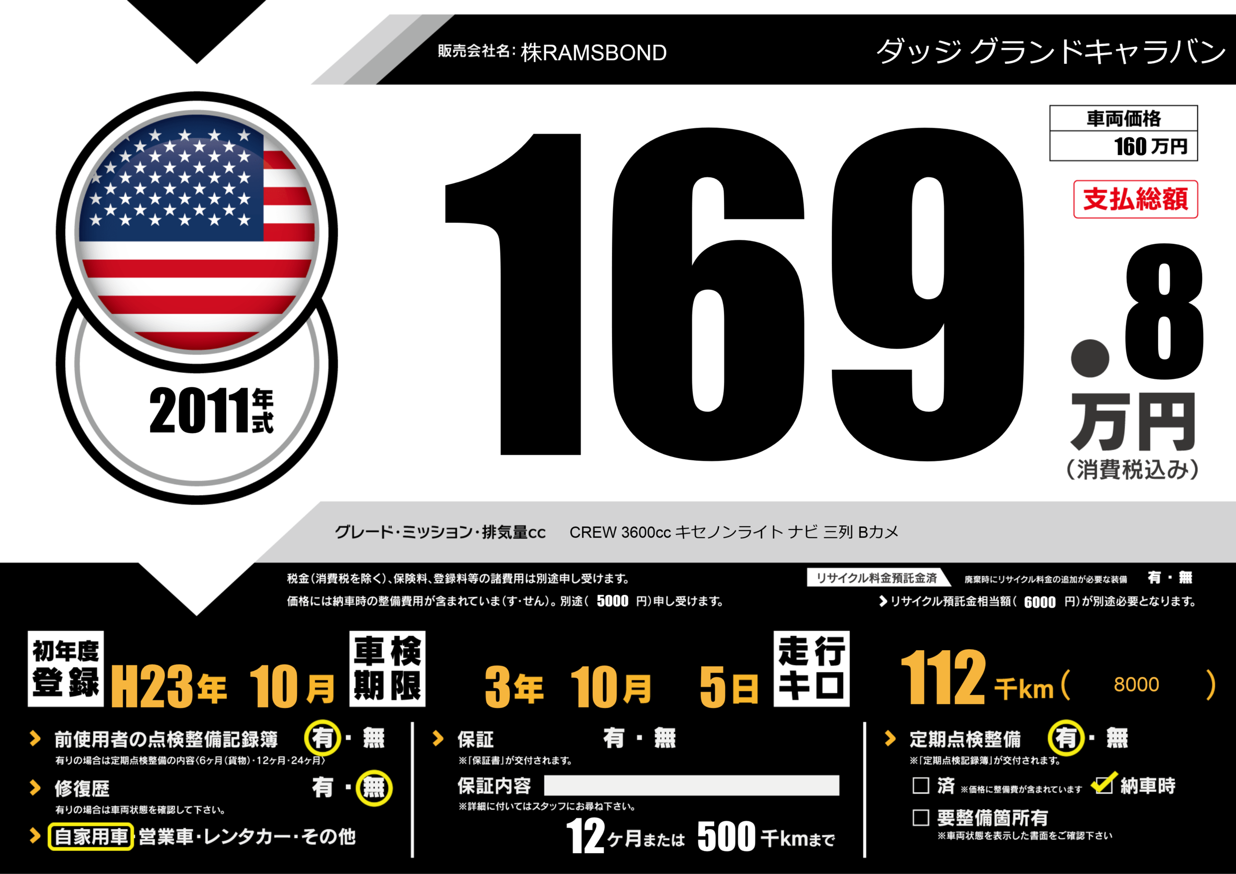 | 走行キロ | 11.2万km | 初年度登録 | H23年10月 |