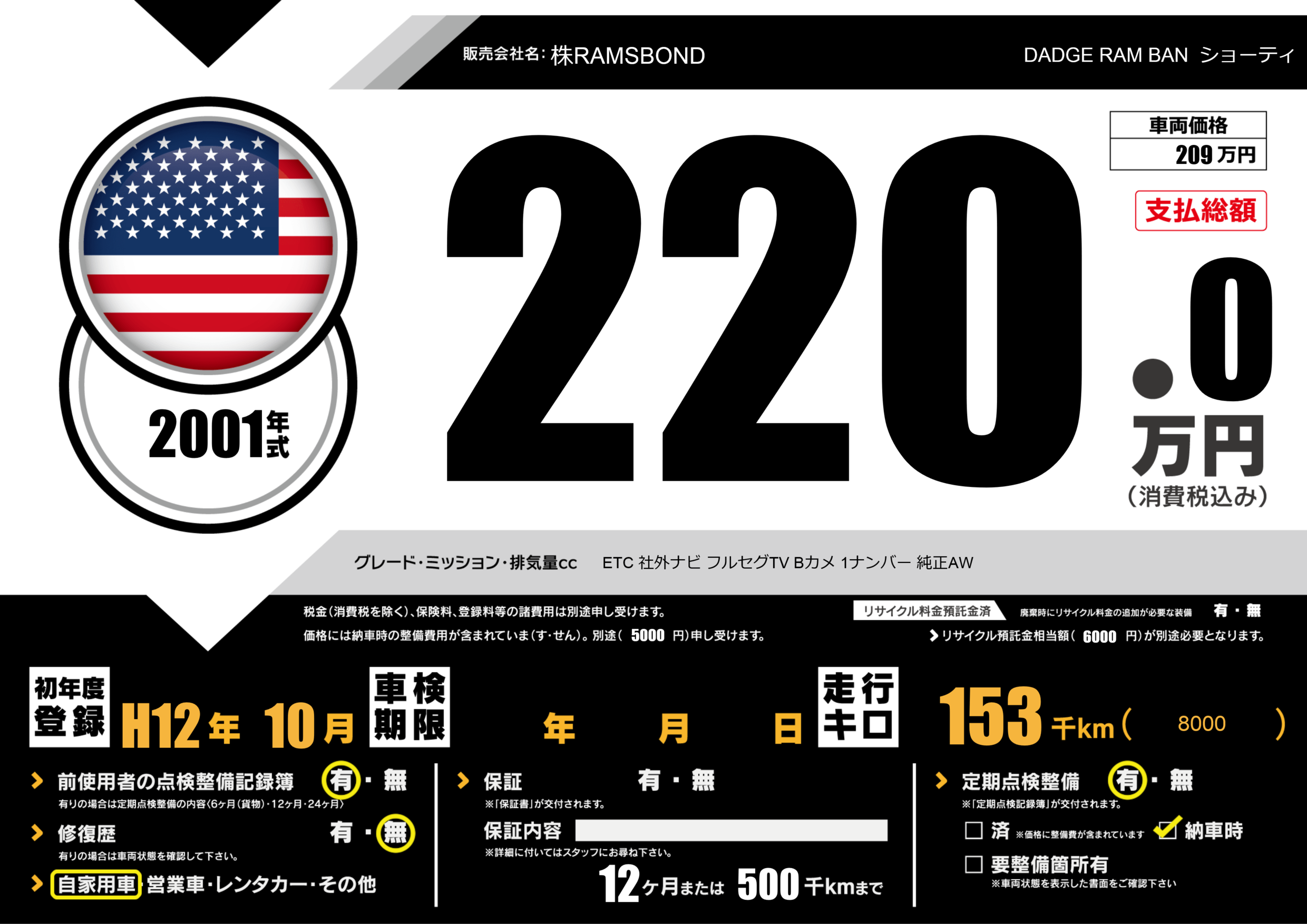 | 車名 | DADGE RAM BAN ショーティ | グレード ミッション 排気量 |