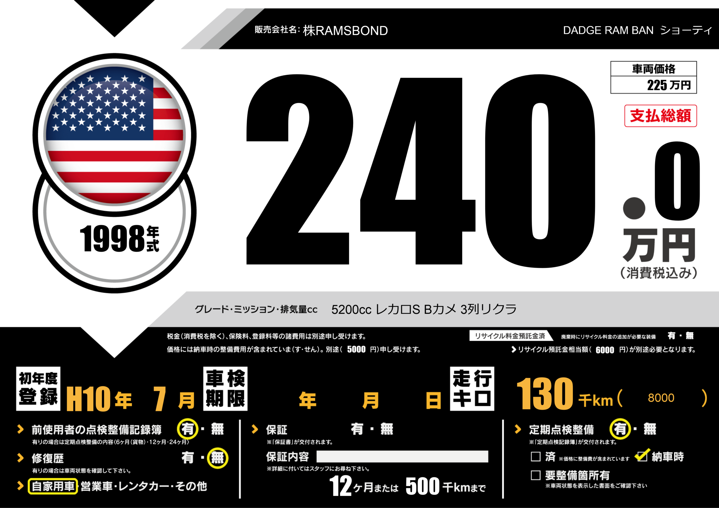 | 車名 | DADGE RAM BAN ショーティ | グレード ミッション 排気量 |