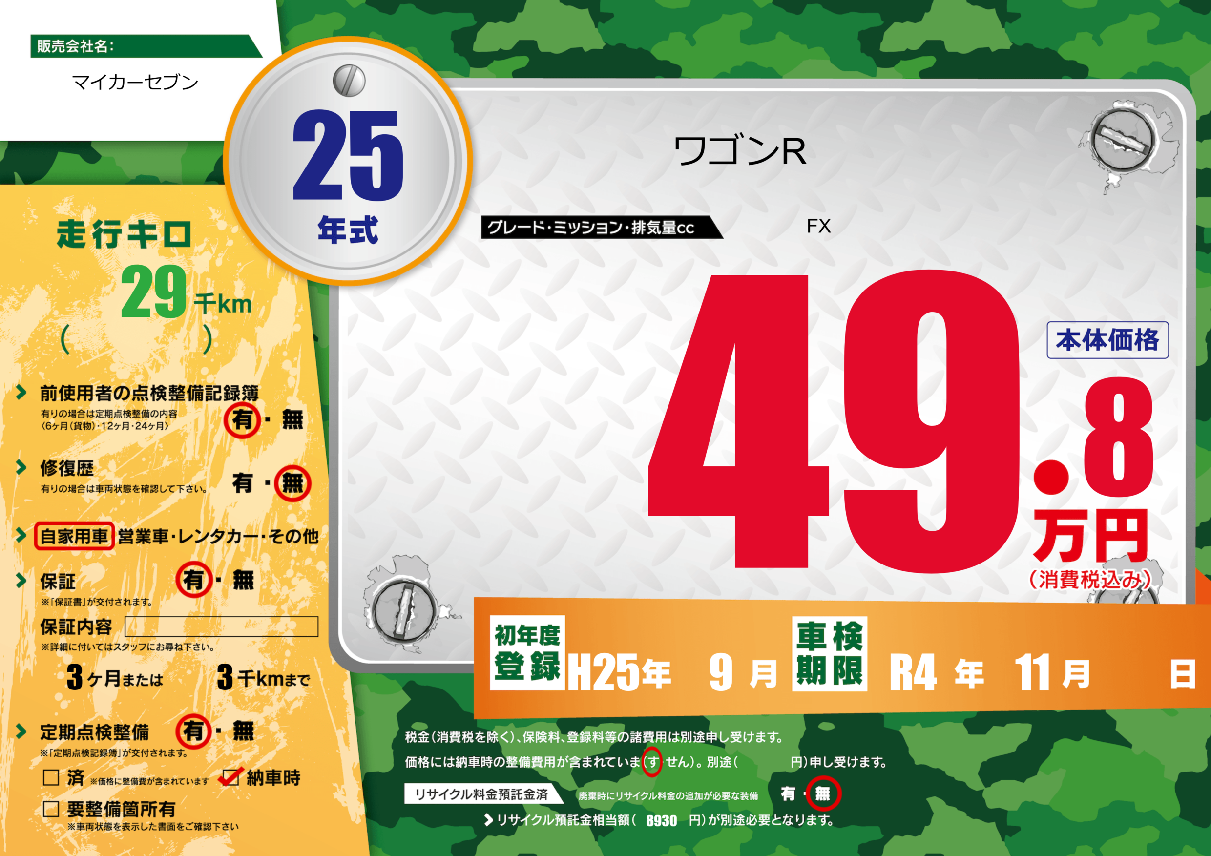 | 車名 | ワゴンR | グレード ミッション 排気量 |