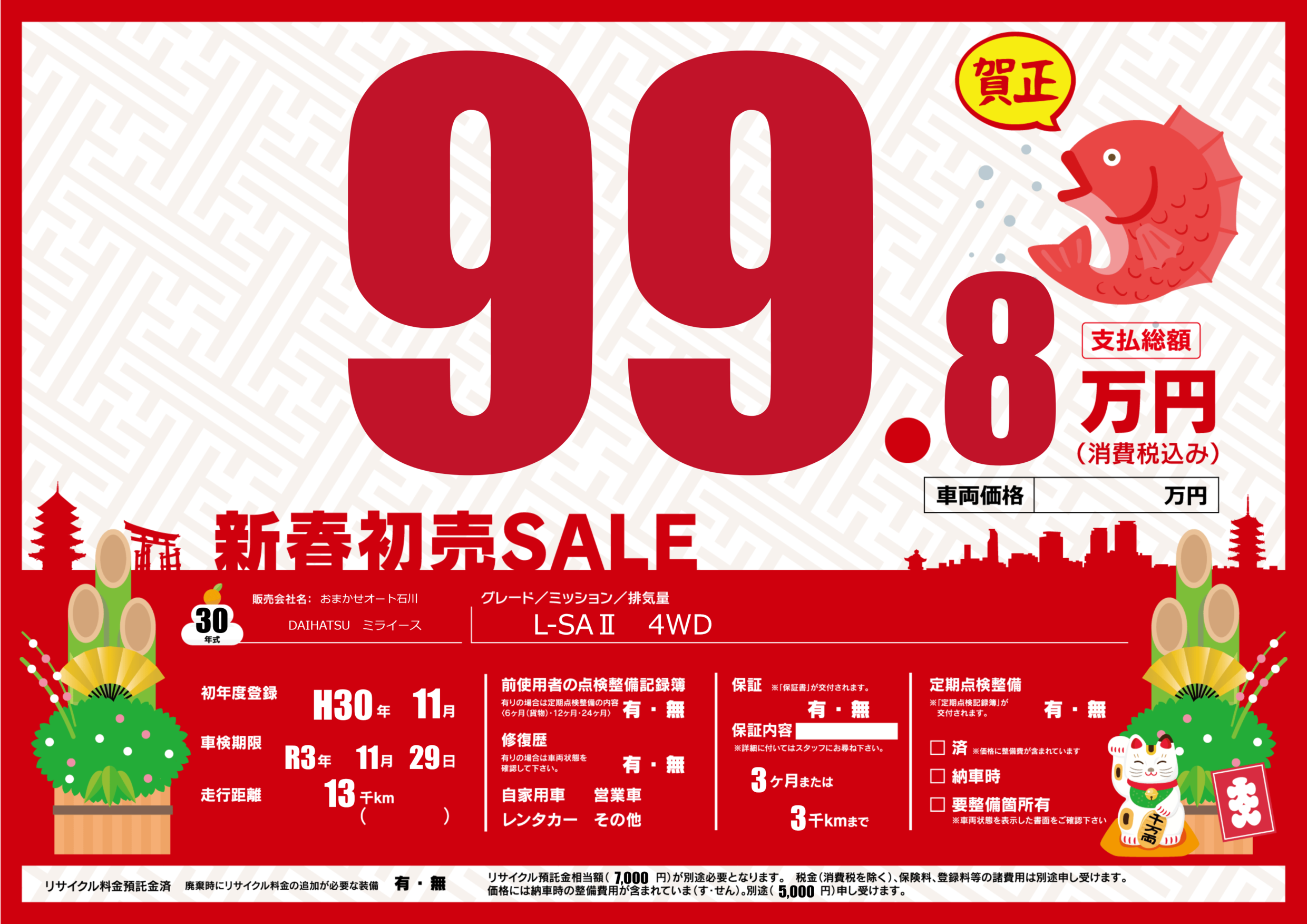 保証なし 保証内容(---) 3ヶ月または(3)千kmまで |