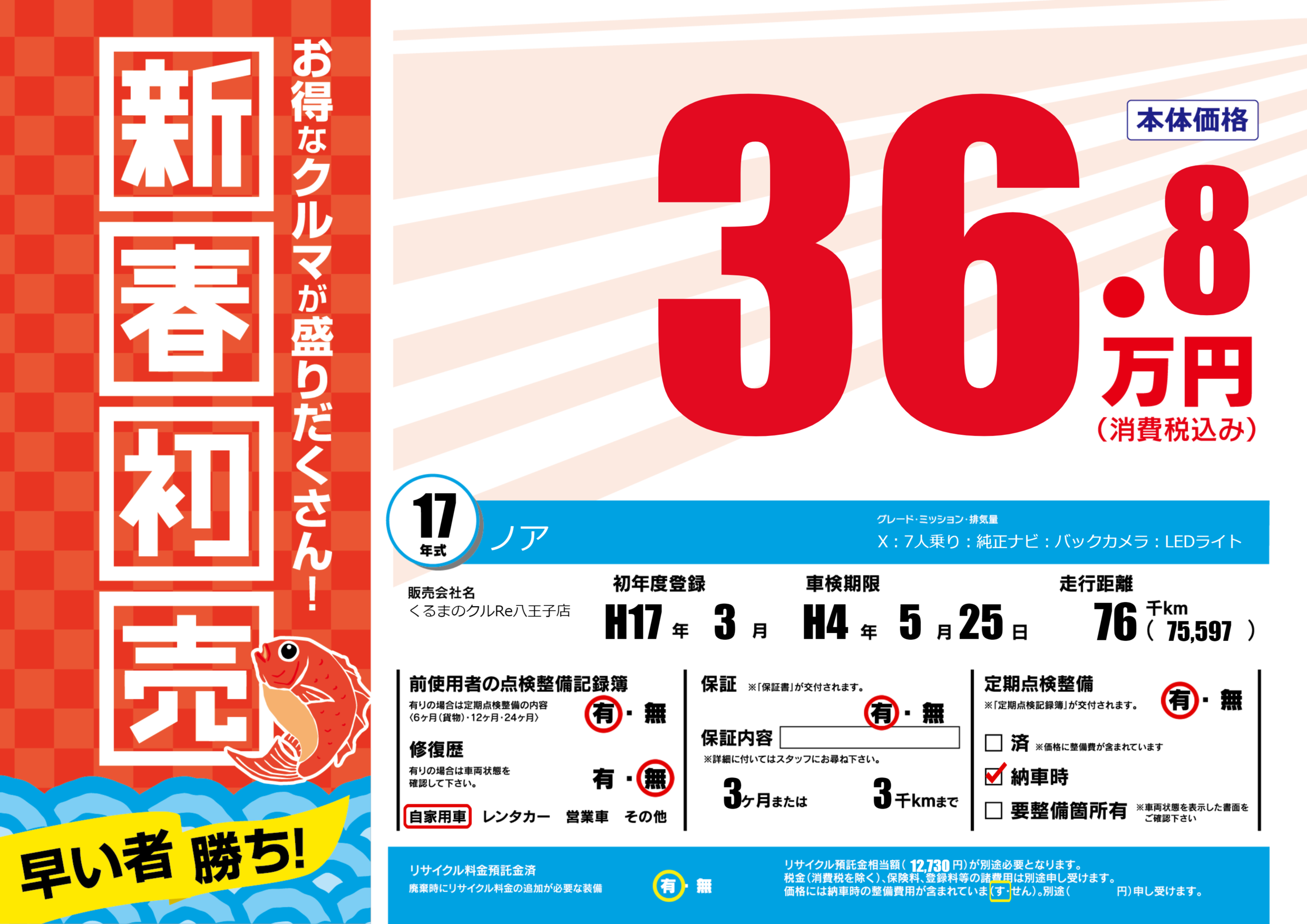 | 走行キロ | 7.6万km | 初年度登録 | H17年3月 |