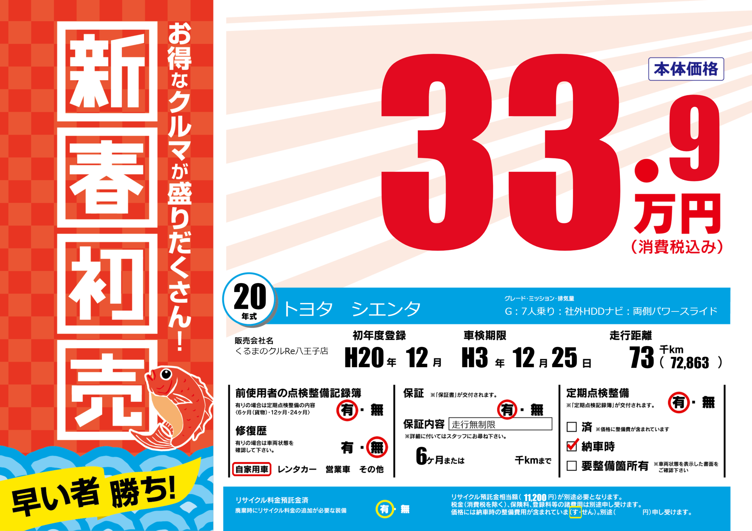 | 車名 | トヨタ シエンタ | グレード ミッション 排気量 |