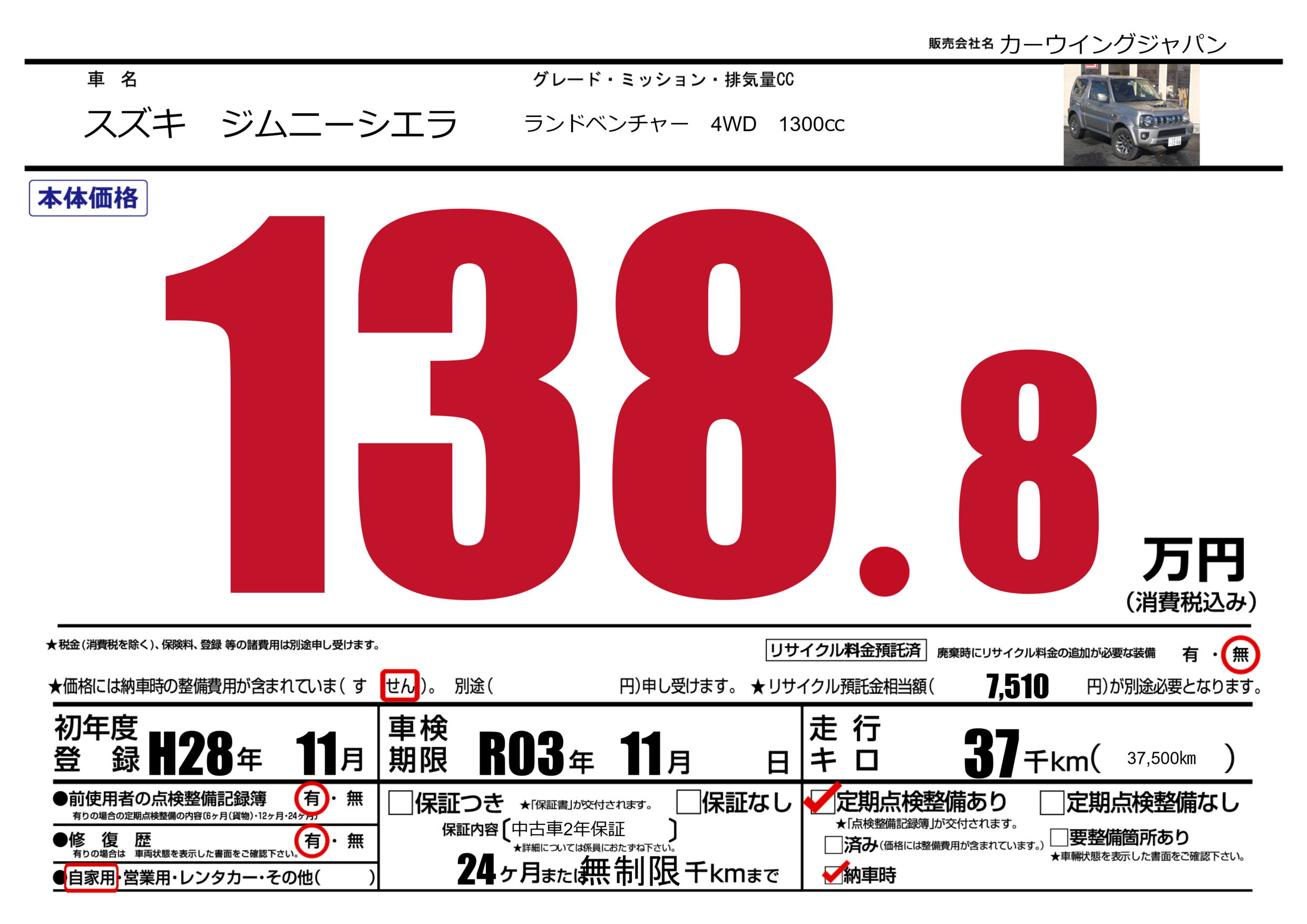 | 車名 | スズキ ジムニーシエラ | グレード ミッション 排気量 |