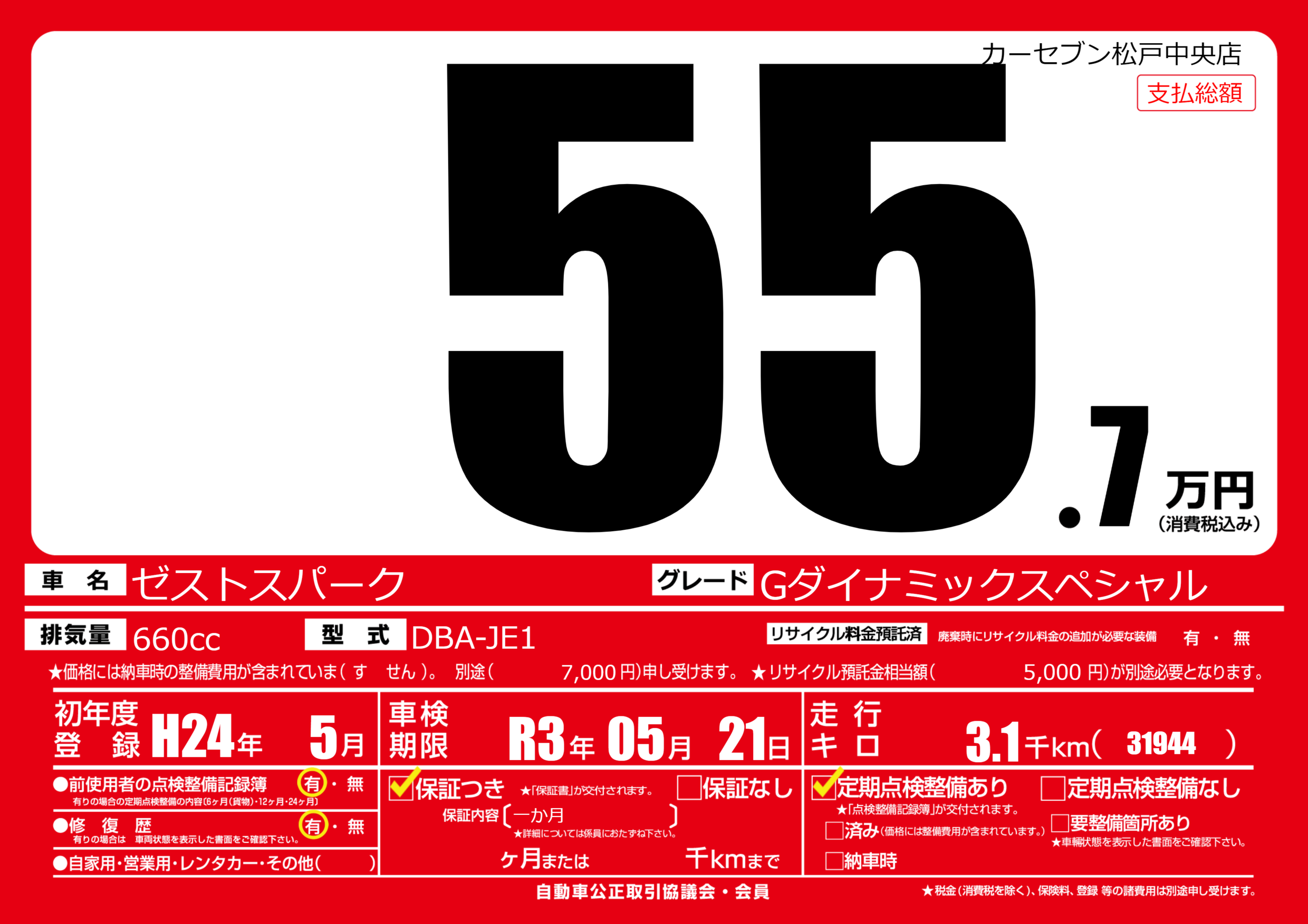 | 車名 | ゼストスパーク | グレード ミッション 排気量 |