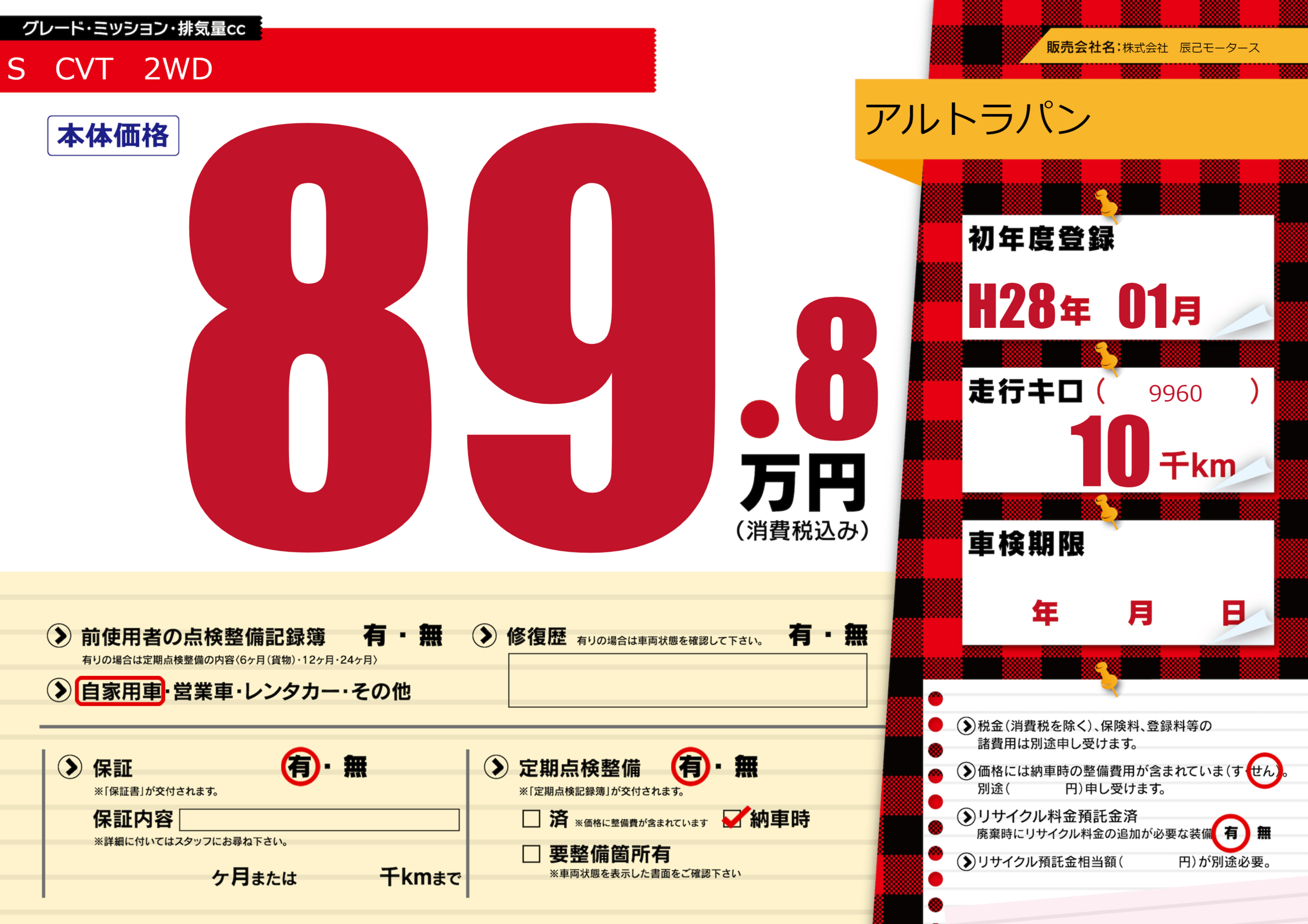 | 定期点検整備 | 定期点検整備あり 納車時あり | ||