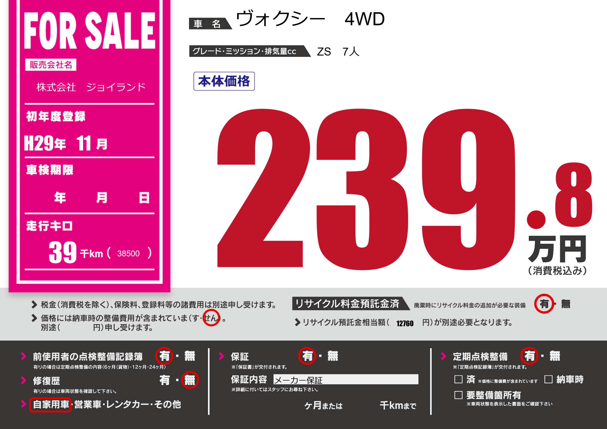 | 車名 | ヴォクシー 4WD | グレード ミッション 排気量 |