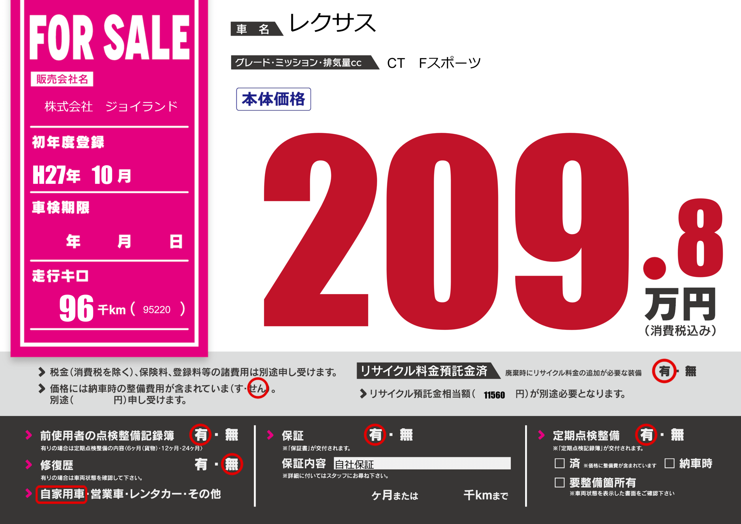 | 車名 | レクサス | グレード ミッション 排気量 |