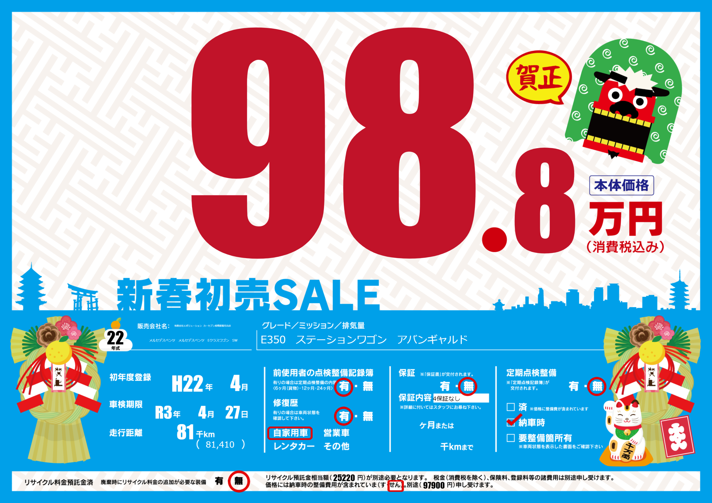 | 車名 | メルセデスベンツ メルセデスベンツ Eクラスワゴン SW | グレード ミッション 排気量 |