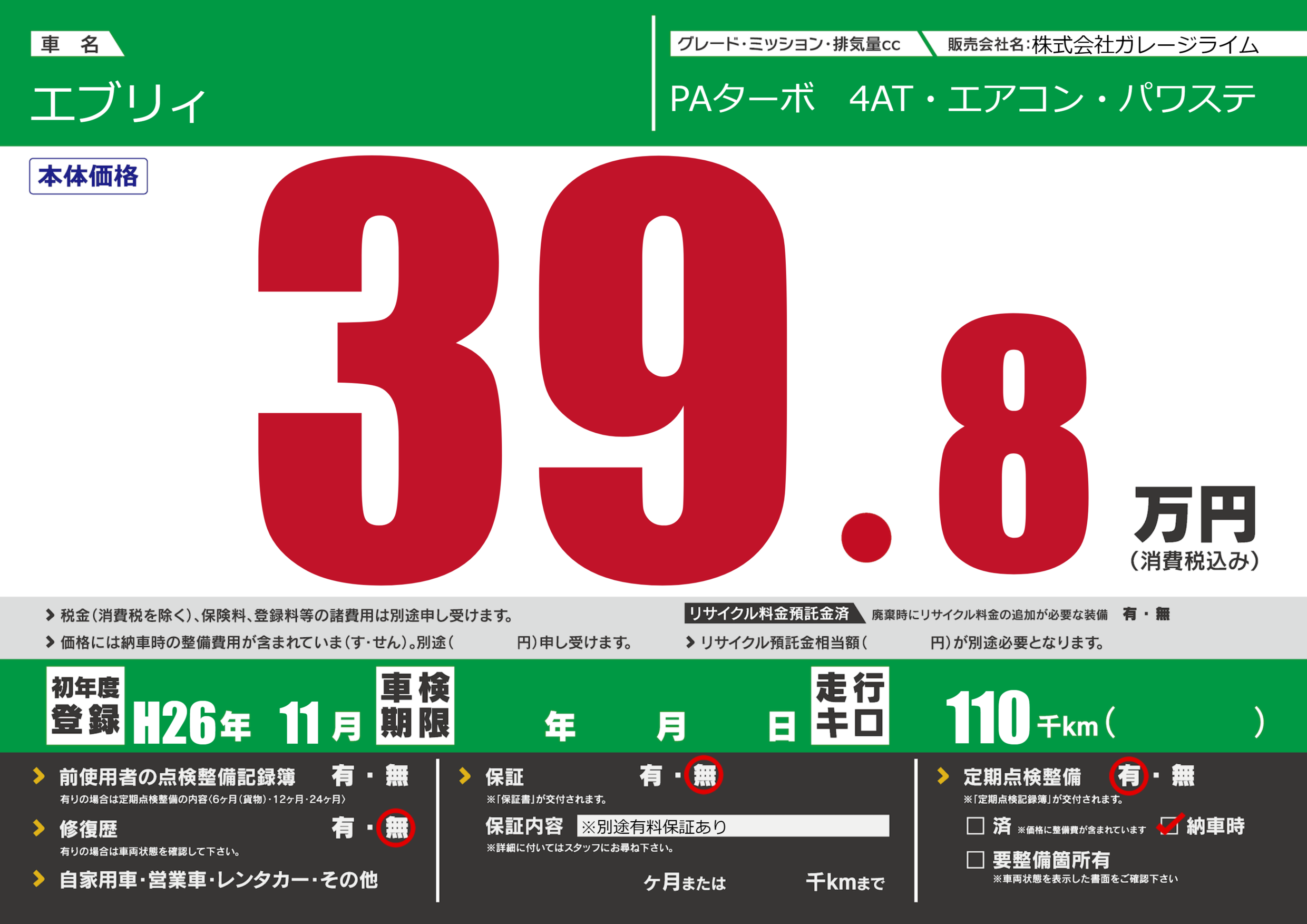 | 走行キロ | 11万km | 初年度登録 | H26年11月 |