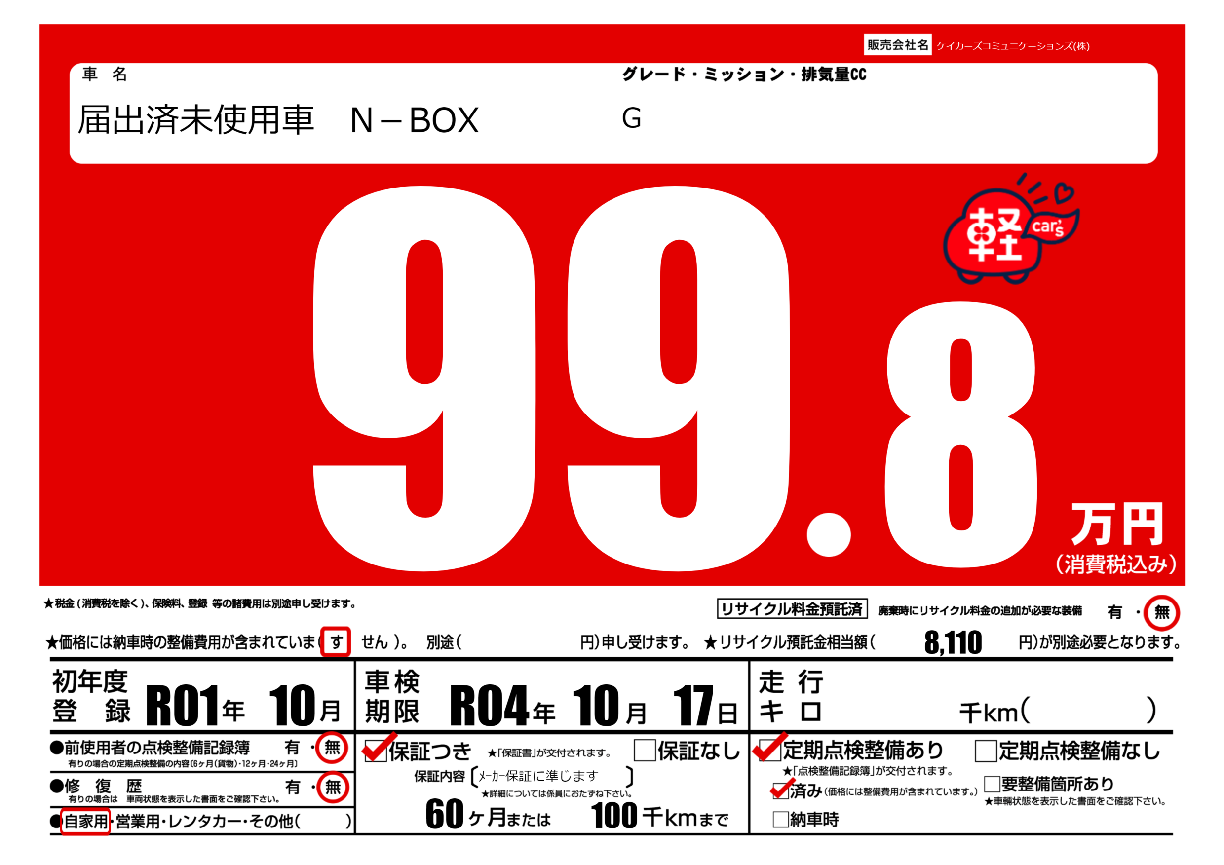 | 定期点検整備 | 定期点検整備あり 定期点検整備済み | ||