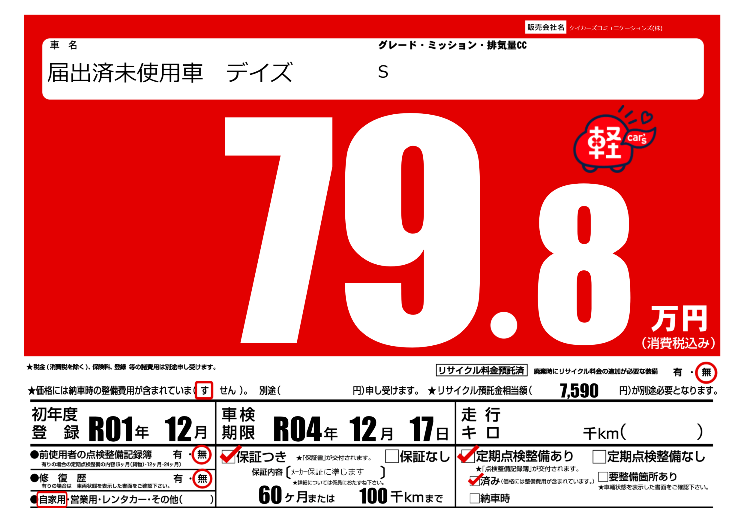 | 車名 | 届出済未使用車 デイズ | グレード ミッション 排気量 |